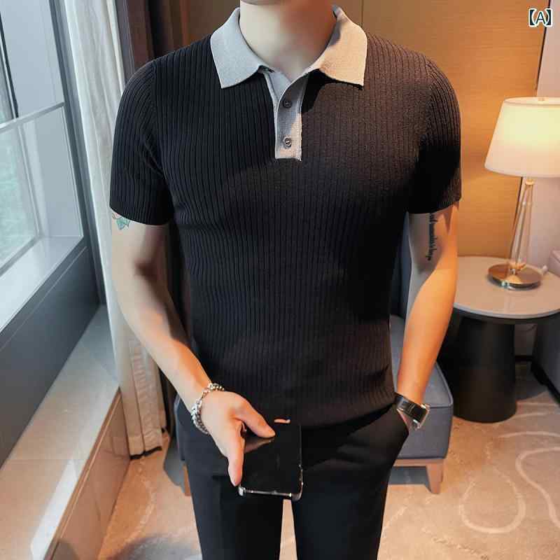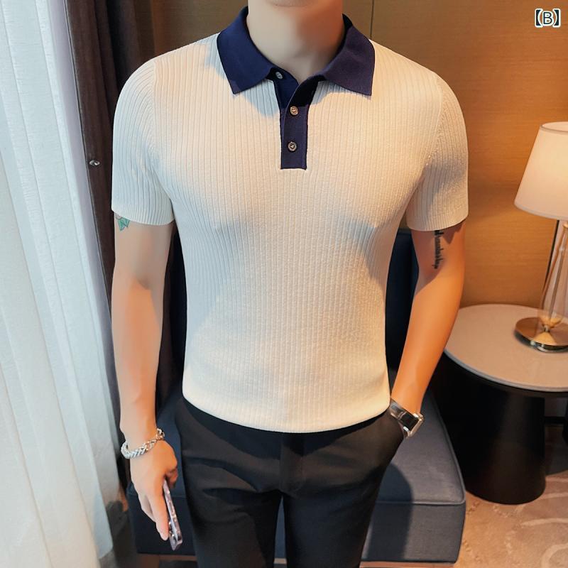 シャツ メンズ 春 夏 ニット トップス ストライプ 冷感 ポロ 半袖 薄手 通気性 スリムフィット コントラスト ハイエンド T