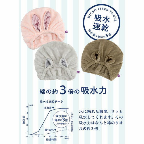-------------------------------------------------------------- 画像はイメージです。 ※ PC環境により実際の色味や質感と異なって表示される場合がございます。 ※ 部品・パーツなどの一部の商品では本体の商品画像を使用しております。 ※ 製品の仕様・画像・パッケージは、メーカー側から予告なく変更される場合があります。 -------------------------------------------------------------- 吸水・速乾ヘアキャップお風呂上りにすっぽり被るだけで拭く手間が省ける!ドライヤー時間を大幅に短縮!簡単にヘアケアができる、Zooieシリーズに上品なサテン地を使用した仲間が新登場!●被るだけでタオルドライできる「ヘアキャップ」ヘアキャップをお風呂後に被るだけでタオルドライの代わりに!使い方はキャップを被り髪の毛を入れるだけなのでとても簡単!お風呂の後にゆっくりスキンケアをしたり、ボディクリームを塗ったりする時間にも最適です。●「可愛い」と「快適」を両立!髪を乾かしたり、洗顔やメイク時に邪魔になる髪をまとめるなど、多くの場面で大活躍!可愛いデザインでいつものバスタイムや、メイクタイムが楽しくなるだけではなく、前髪や後髪をまとめてお家でのリラックスタイムをより快適にしてくれます。お友達とのパジャマパーティーや、おそろいでかぶって写真撮影、ひとつ持っていると便利なアイテムです!●吸水速度は綿タオルの約3倍!マイクロファイバー生地がお風呂上がりの水分をしっかり吸収してくれます。●まるでマシュマロのようなふんわり優しい肌触り!カットパイル特有のふわふわ肌触りが、髪の毛を優しく包み込んでくれます。通常のタオルはパイル状になっているため、引っかかりやすいのに対して、本商品はカットパイル仕上げ(表面を刈り取っている)のため、引っかかりにくく上質で滑らかな肌触りに仕上げています! ■仕様サイズ:(約)W230×D240×H27mm頭囲:(約)440〜800mm重量:[サテンウサギ](約)58g主材質:ポリエステル/ナイロン/ポリウレタン原産国:中国 【#144】