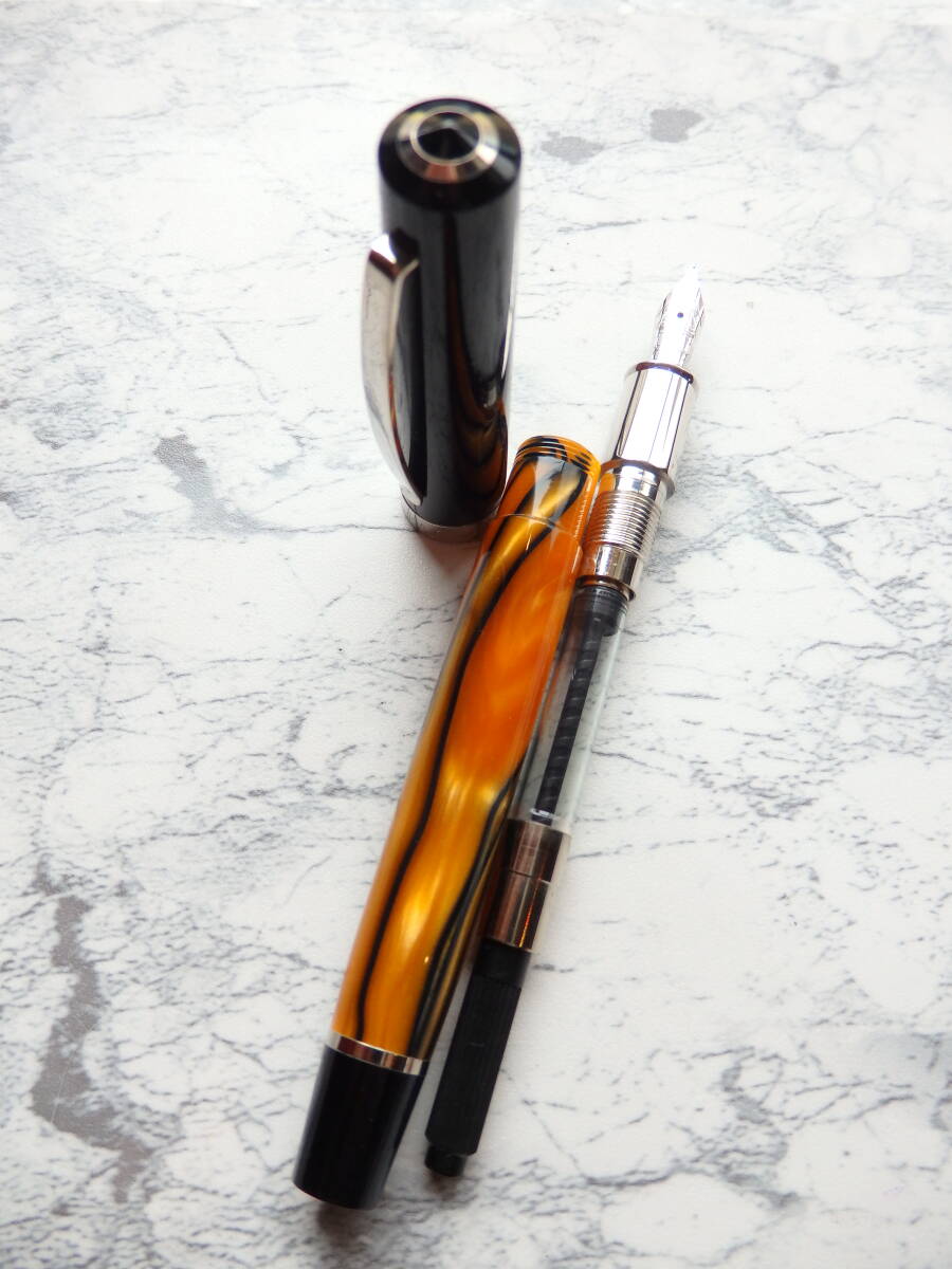 キャップを閉じた状態の全長:約138mm、軸径:約13mmの両用式の万年筆です。 オマスのボローニャコレクションのナイト・オブ・ボローニャ万年筆です。 この万年筆は、バレルは、夕闇が迫る夕暮れ時のボローニャの地平線をイメージし、 キャップは、既に漆黒に近い群青色の空をマザーオブパールのイタリアンレジンでイメージし、 両者が絶妙なコントラストを織りなす自然界の美を現した逸品です。 キャップリングが外れたらしく、それを透明ボンドで再接着したらしいですが、キャップの裏側に一部はみ出した部分があります。それ以外は、全体的に使用感の少ないきれいな状態の一本です(主観)。