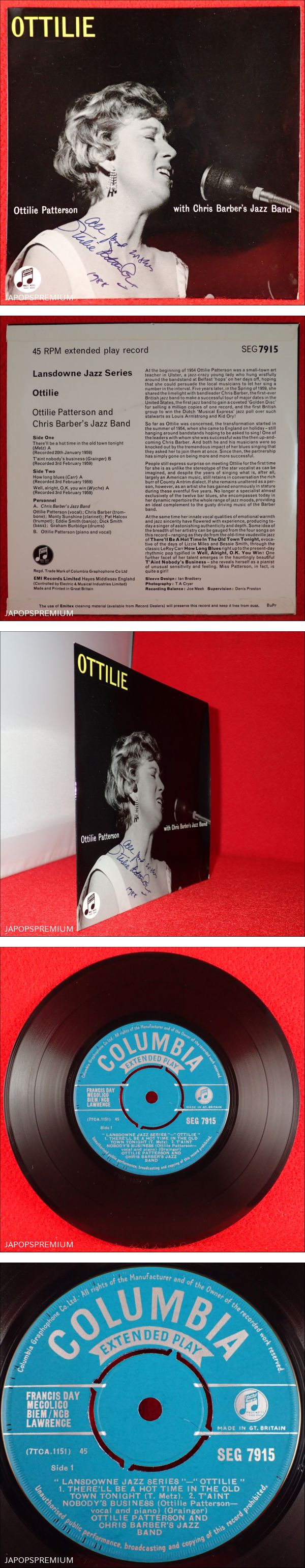 Chris Barber's Jazz Bandのヴォーカリストとして活躍した英国史上最強の女性シンガーであり、表現力・演出力は世界最強!!!そんな彼女がChris Barber's Jazz Bandと共演した幻の英国盤7インチで、きわめて希少なアイテム!1959年録音の幻の作品で、バックの英国ジャズのモダンジャズを牽引したトロンボーン英国神様のChris Barberのバンド演奏が素晴らしすぎてジャズファンなら悶絶確定の銘品!!!マイクの前で熱唱するOTTILIE PATTERSONのフォットカバーも見事で、英国ジャズ関連の7インチEPでは最大の人気盤!!!そして、このアイテムが英国で超人気が高いのは、OTTILIE PATTERSON自身がピアノを弾く楽曲のA2があるからです!!!この名演と熱唱は、世界の女性ボーカル最大の名演!!!これを聴いて、あまりの素晴らしさにその場で失神されても責任もてない究極のアイテムです!!!英国ジャズならではの上品で気品に満ちた名演と熱唱!そして、コレクター憧憬のこの芸術性高いデザイン人気のフォットカバーも見惚れます!ジャズEP最高峰のサウンドクオリテイと評されている英国COLUMBIA盤の7インチEP!ブリテイッシュの誇りを感じさせてくれる英国盤の最高音質と45回転から放たれる究極の最高音圧!それも、本人直筆サインありのデッドストック超極美品!!!まさに、これを逃すと神様に叱られるレベルの究極のアイテム!!!