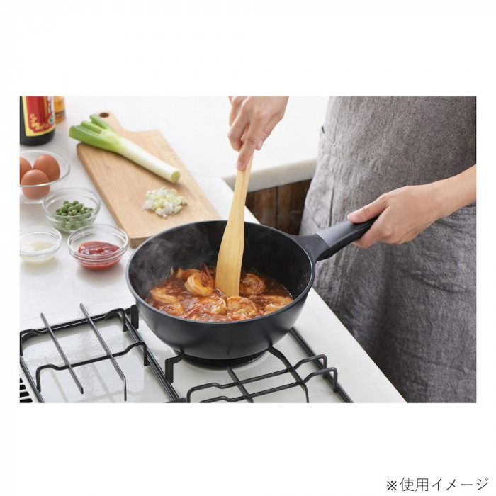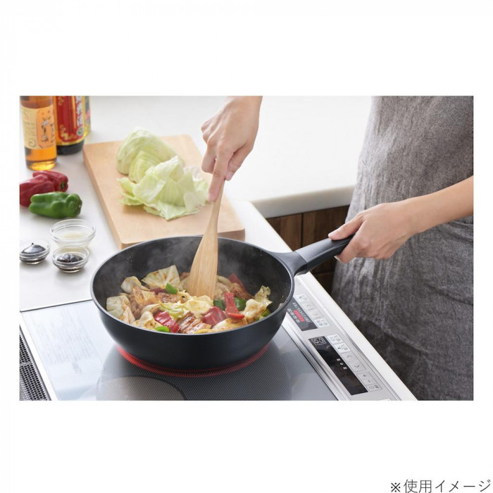 | たっぷり入る深型フライパンなので、焼き物はもちろん、揚げ物、茹で鍋としても使えます。フライパンの内面はフッ素樹脂加工でくっつきにくく、お手入れも簡単。調理具合が分かるガラス蓋は、スタンド式のハンドルなので、調理中も置き場所に困りません。フライパン本体は軽量タイプで扱いやすくなっています。 ※金属ヘラは使えません。 |