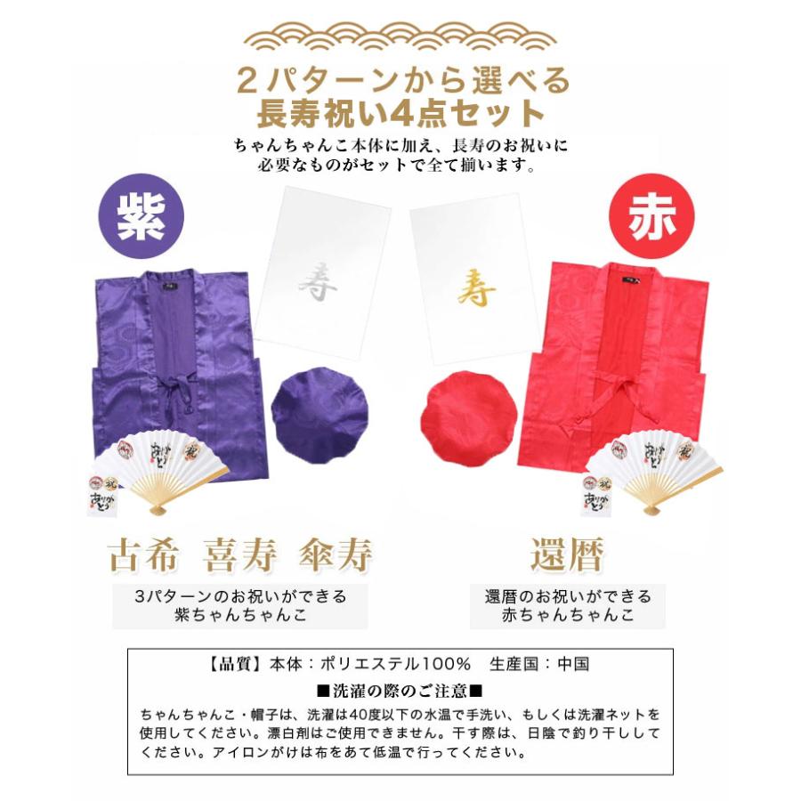 60歳の還暦、70歳の古希、77歳の喜寿、80歳の傘寿を迎える方へのお祝い品の定番、ちゃんちゃんこ(祝着)と頭巾、祝扇の3点に当店オリジナルシールを加えた4点セットになります。