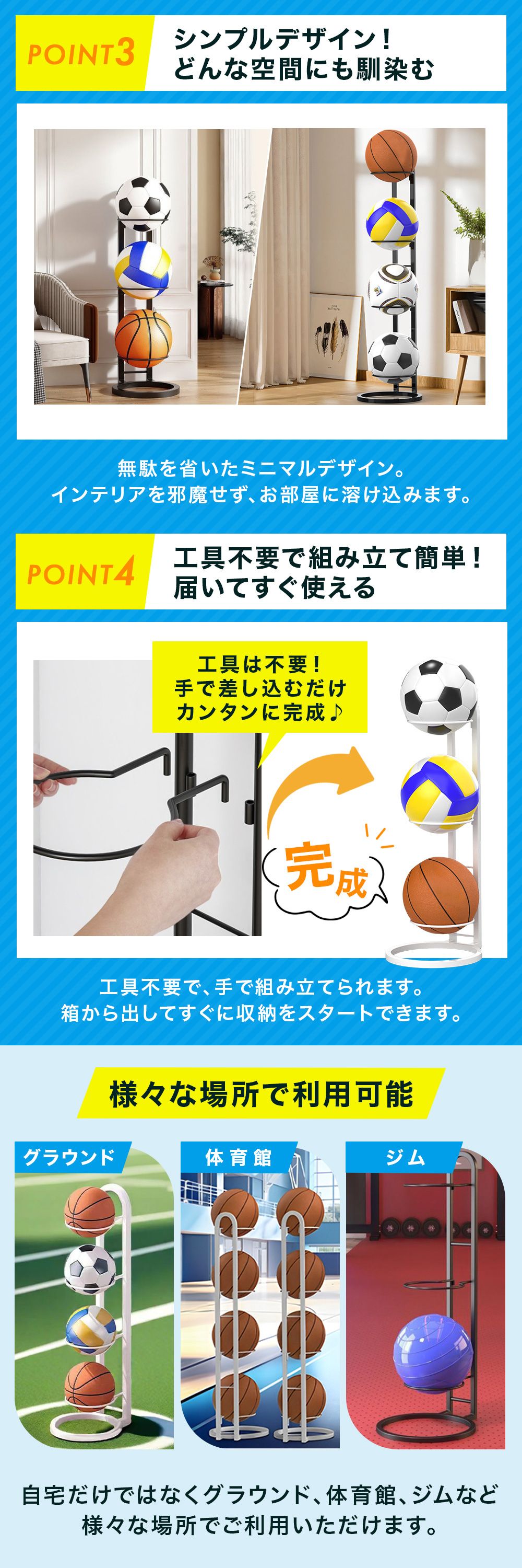 | 特徴 | 【選べる2カラー×2〜5段】 散らかるボールをスマートに解決! もうボールの収納に困らない!「あったらいいな」を形にしたボールスタンドです。 2段から5段までタイプで、あなたの空間にぴったりの一台が見つかります。 <<選ばれる4つの理由>> 1. 驚きの省スペース設計 縦型収納で、ボール1個分のわずかなスペースを有効活用!部屋の隅や玄関など、デッドスペースがすっきり片付く快適空間に早変わりします。 2. 圧倒的な耐久性 高品質な特殊多層塗装スチール製なので、錆びにくく頑丈。安心して長く使える、頼れる設計です。 3. どんな空間にも溶け込むデザイン 無駄を省いたミニマルデザインは、インテリアの邪魔をせず、どんなお部屋にもしっくり馴染みます。 4. 組み立ては、あっという間! 工具不要で、箱から出してすぐに組み立て可能。届いたその日から、ストレスフリーな収納がスタートできます。 自宅はもちろん、体育館、グラウンド、ジムなど、様々な場所で活躍するこのボールスタンドで、もう散らかったボールに悩まされることはありません! |