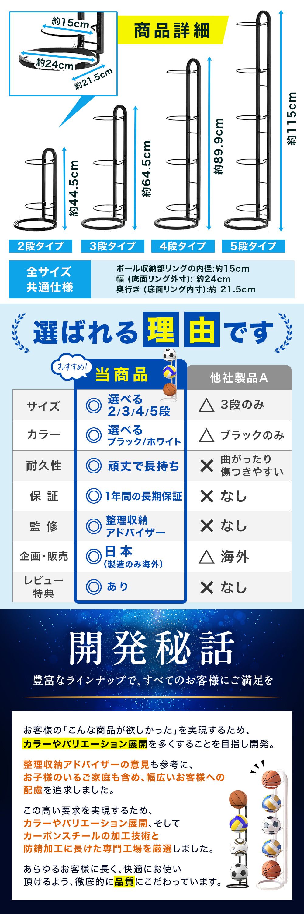 | サイズ | ・2段タイプ:約44.5cm ・3段タイプ:約64.5cm ・4段タイプ:約89.9cm ・5段タイプ:約115cm ※以下、全タイプ共通仕様 ・ボール収納部リングの内径:約15cm ・幅(底面リング外寸):約24cm ・奥行(底面リング内寸):21.5cm |