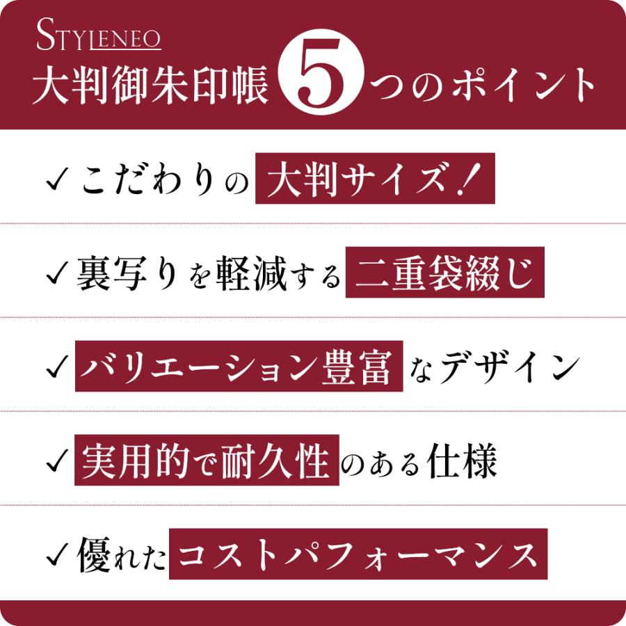 | 「書き置きの御朱印が大きくて、今までの帳面にはみ出てしまう…」 → 【大判サイズ】で、さまざまなサイズの御朱印にゆとりを持って対応。貼るのもすっきりです。 「墨が裏ににじんで、他のページが汚れてしまわないか心配…」 → 【裏写りしにくい二重構造】が、墨のにじみを軽減。大切な御朱印を美しい状態で保管できます。 「御朱印帳を持ち歩くので、汚れや摩擦が気になる…」 → 【高級感のある光沢コーティング】が、表紙を保護。日常の持ち運びにも強い耐久性を発揮します。 「パッと開いて、集めた御朱印を一度に眺めたい!」 → 【蛇腹式設計】で、ページをめくる手間なく、すべての思い出を一望できます。 |