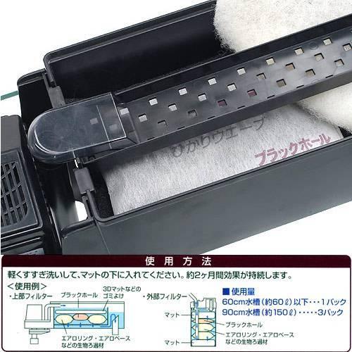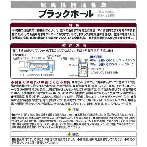 | ご注意 | ※ピートや防藻剤と併用すると、有効成分を吸着する場合があります。 ※色素系の魚病薬を使用される場合は、本製品を取り出してください。 |