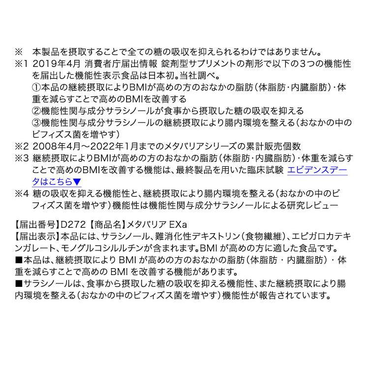 | 機能性表示食品 消費者庁届出番号:D272 届出商品名:メタバリアEXa 届出表示:本品には、サラシノール、難消化性デキストリン(食物繊維)、エピガロカテキンガレート、モノグルコシルルチンが含まれます。BMIが高めの方に適した食品です。 ■本品は、継続摂取によりBMIが高めの方のおなかの脂肪(体脂肪・内臓脂肪)・体重を減らすことで高めのBMIを改善する機能があります。 ■サラシノールは、食事から摂取した糖の吸収を抑える機能性、また継続摂取により腸内環境を整える(おなかの中のビフィズス菌を増やす)機能性が報告されています。 本品は、事業者の責任において特定の保健の目的が期待できる旨を表示するものとして、消費者庁長官に届出されたものです。ただし、特定保健用食品と異なり、消費者庁長官による個別審査を受けたものではありません。 届出情報は消費者庁が運営する機能性表示食品の届出情報検索サイトにてご確認ください。 ※届出番号欄に「D272」と入力し検索してください。 |