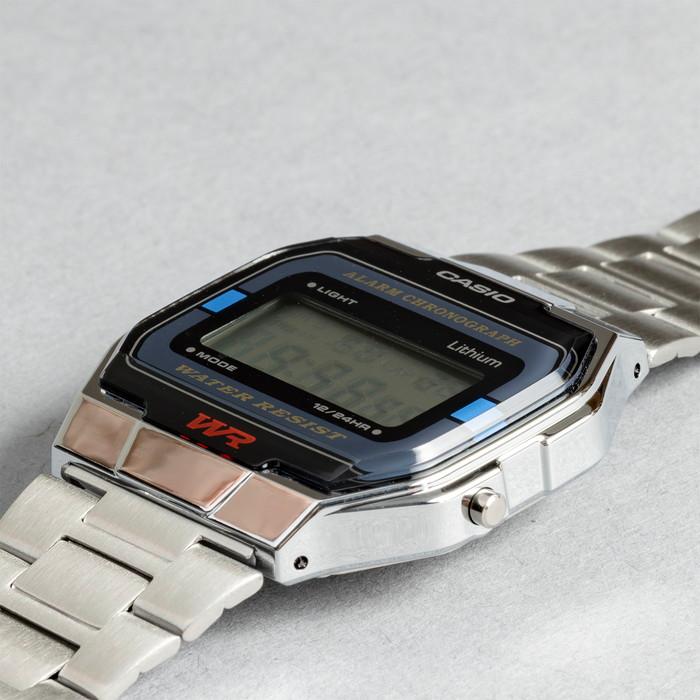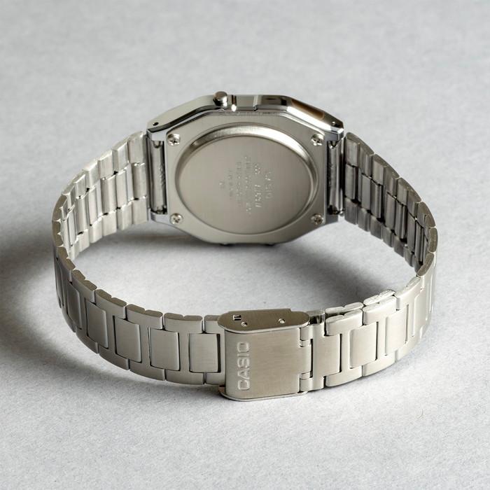 カシオA163WA-1は、文字盤の構成要素が整然と整えられた、シンメトリーデザインの腕時計です。文字盤上下に配置された、CASIOロゴ,ALARM CHRONOGRAPH,WATER RESIST,WRの文字列は、水平方向にセンタリングされ、文字盤の中心点を貫くx軸を対称軸として、線対称に配置されています。液晶窓が中心から下にオフセットされているため、LIGHT,Lithium,MODE,12/24HRの機能表示は、上下対称ではありませんが、違和感を覚えさせない場所に整列してあるうえ、左右方向は鏡像位置に揃えられていますから、ほぼ完全なシンメトリーといって良いでしょう。カットガラス状に面取りされた風防や、ケース上下に位置する等脚台形のレリーフなど、装飾的要素も積極的に採用されています。