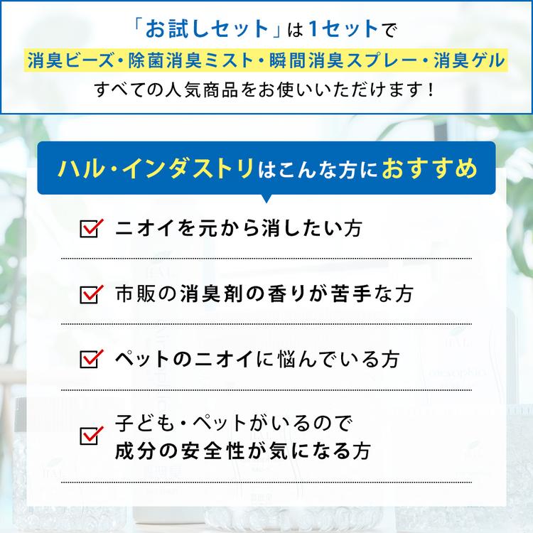 | 成分 | <除菌消臭ミスト>植物抽出エキス、除菌成分 <消臭ビーズ>植物抽出エキス、吸水性樹脂 <消臭ゲル>ゲル化剤、植物抽出エキス、界面活性剤、食用色素 <瞬間消臭スプレー>植物抽出エキス |