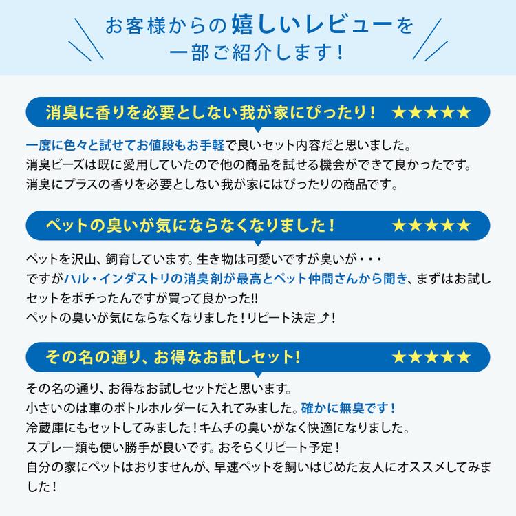 | 内容量 | <除菌消臭ミスト>300ml <消臭ビーズ>(小)140g・(大)600g <消臭ゲル>180g <瞬間消臭スプレー>420ml |