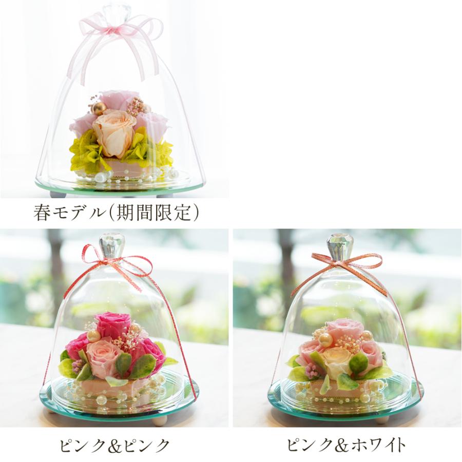 | クリスタルカットビジュー ガラスドームのトップはクリスタルカットのビジュー。 ラグジュアリーな雰囲気がただようガラスベルです。 ガラスを包むリボンも上品で華奢なさりげないものなのでプリザローズを邪魔しません。 |