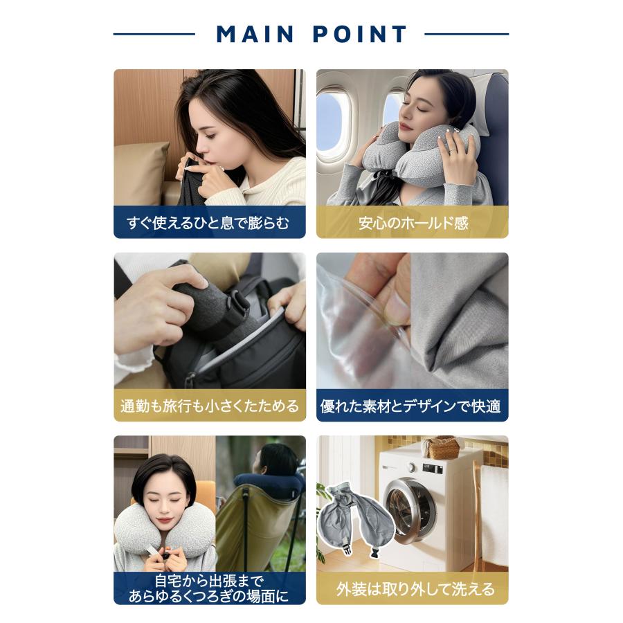 | 【人間工学U字で首サポート】 首の傾きを抑えて快適。首・肩の負担を軽減し心地よい休息をサポート 【軽量&携帯ラクラク】 空気式でとても軽量。空気を抜けば手のひらサイズに折りたたみOK 【ポンプ不要で簡単送気】 口で数回ふくらませるだけ。すぐ使えて準備もかんたん 【洗える取り外しカバー】 カバーは取り外して洗濯可能。いつでも清潔&衛生的 【幅広いシーンで活躍】 飛行機・バス・車・オフィス休憩・自宅リラックスに最適 |