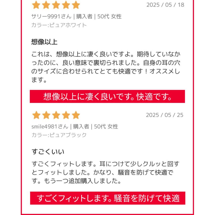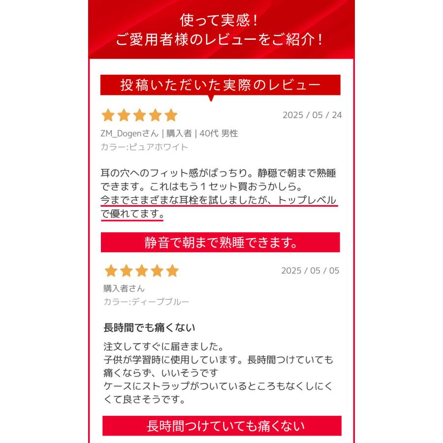 | 軽量設計と人間工学に基づいたカーブデザインにより、耳の形にぴったりフィット。長時間の装着でも圧迫感を感じにくく、快適に使用できます。特に寝ながら使う方におすすめの形状です。 |