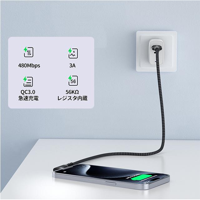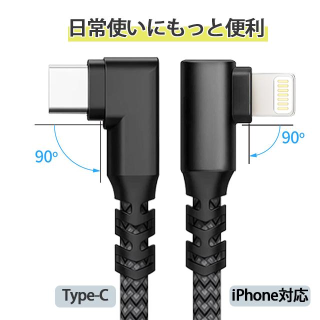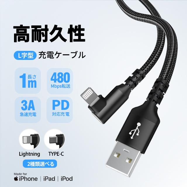 usb ケーブル 充電ケーブル ライトニング 横向き L字型 2A 3A type c lightning 長さ 1/2m TPU ナイロン編み 断線防止 急速充電