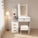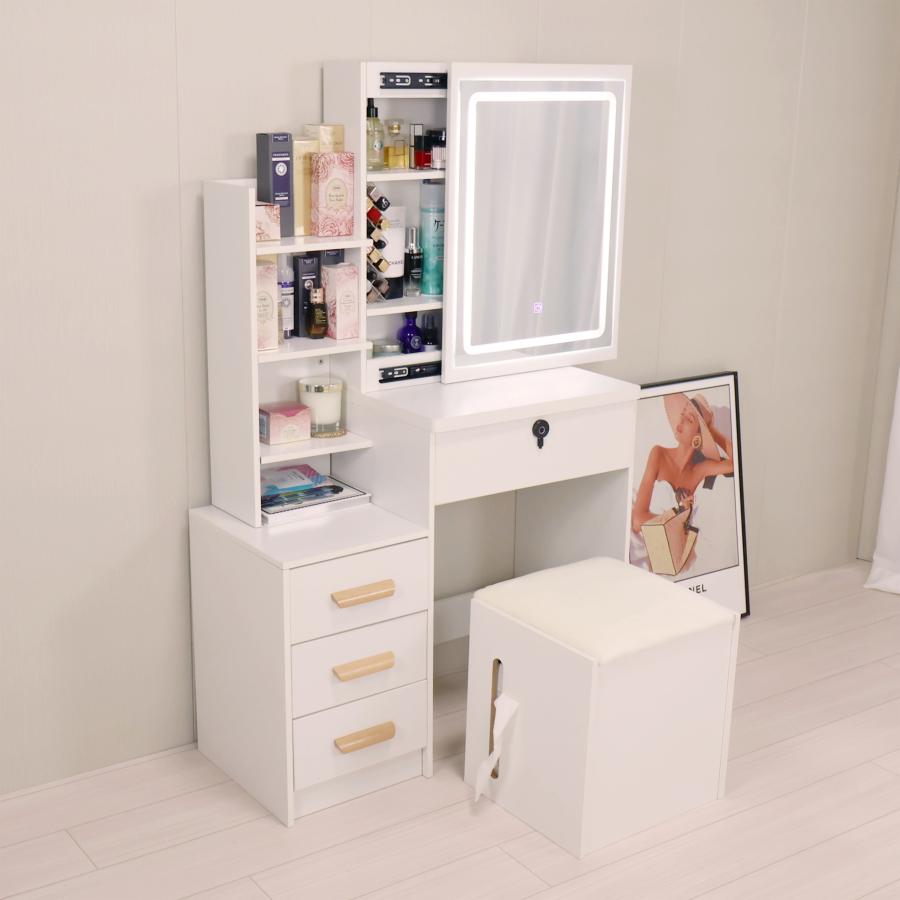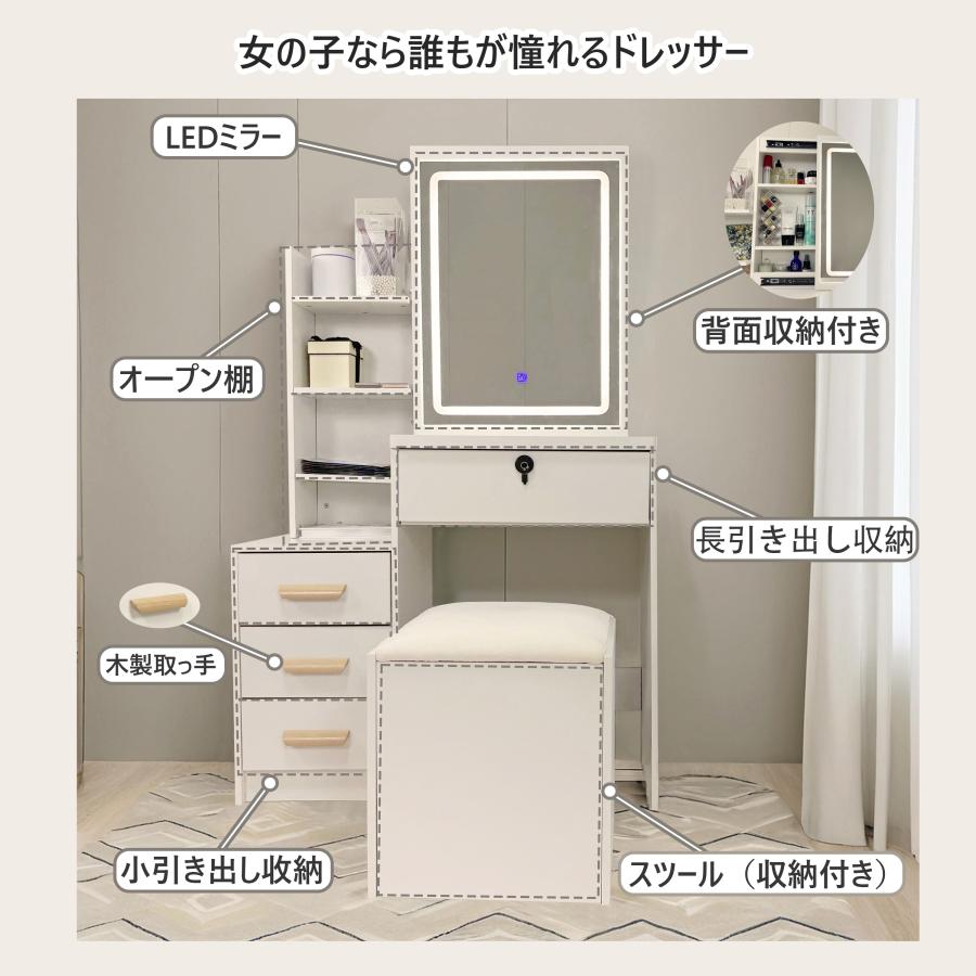 このドレッサーは、メカニカルキー付きで安全性を高め、ミラーには照明が付いており、化粧時の視認性を向上させます。白を基調としたデザインは、どんな寝室にも調和し、可愛らしさとおしゃれさを兼ね備えています。大量収納が可能で、化粧品やアクセサリーをすっきりと整理できます。取っ手は変更可能で、個々の好みに合わせたカスタマイズが可能です。椅子も付属しており、快適な化粧時間を提供します。【【コンパクトドレッサー】小さなスペースで大きな収納力を実現!たっぷり収納力:大きな引き出しとオープン棚で、化粧品やアクセサリーなどたくさんのアイテムをすっきり収納。省スペース設計:コンパクトサイズだから、寝室やちょっとしたスペースにもぴったり収まります。かわいいデザイン:お部屋の雰囲気を明るくする、キュートでおしゃれなデザイン。鍵付き収納:貴重品や大切なものをしまえる、プライベートな鍵付きスペース付きで安心。収納付き椅子:椅子にも収納できる驚きの機能で、狭いお部屋もスッキリ快適に。機能性とデザイン性を兼ね備えた、一人暮らしや小さなお部屋に最適なドレッサーです。
