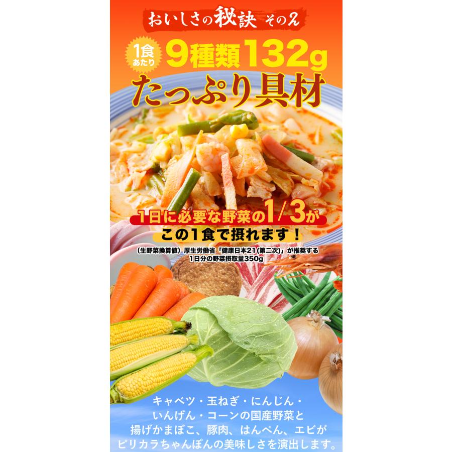 | めん [小麦粉(国内製造)、粉末状植物性たん白/加工でん粉、かんすい、クチナシ色素] 具 [野菜(キャベツ、玉ねぎ、にんじん、いんげん、コーン)、揚げかまぼこ、味付豚肉(豚肉、香辛料、食塩、植物油脂、ポークエキス、ポークオイル)、はんぺん、えび/増粘剤(加工でん粉)、調味料(アミノ酸)、ベニコウジ色素、焼成カルシウム] スープ[食塩、ガラスープ、香味油、シーズニングペースト、調製ラード、マルトデキストリン、アサリエキス、しょうゆ、ラー油、菜種油、酵母エキス、たん白加水分解物、乳たん白、香辛料/調味料(アミノ酸等)、カラメル色素、酸化防止剤(V.E)、香辛料抽出物] 合わせ調味料[菜種油、豆板醤、ポークペースト、砂糖、洋酒、ラー油、しょうゆ、赤唐辛子、おろし生姜、赤ワイン、食塩、ホワイトペッパー/調味料(アミノ酸等)、酒精、酸味料、香辛料抽出物、酸化防止剤(V.E)]、 (一部に小麦・乳成分・えび・いか・ごま・大豆・鶏肉・豚肉を含む) |