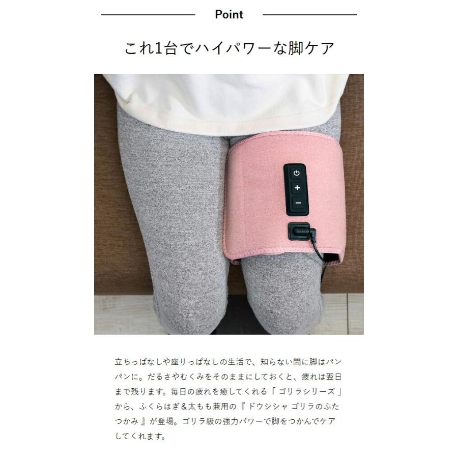 『 DOSHISHA ゴリラのふたつかみ 』は、コンパクトながら絶妙な強さで、片足ずつふくらはぎや太ももを包んでリフレッシュする2WAY仕様の電動フットケアアイテム。強力ポンプ&エアバッグで、まるでゴリラにつかまれるようなハイパワーを実現。さらにツボ押しのようなぽこぽこパーツで、ふくらはぎまたは太ももをすっきりケアします。電源につないでボタンを押すだけのシンプル操作で、パワー調節は3段階。大きな面ファスナーで装着も簡単。10分タイマー搭載の安心設計です。