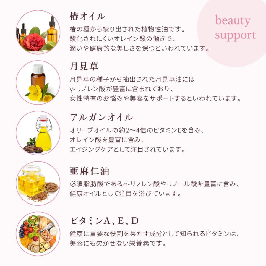 ぶどう油(イタリア製造)、アマニ油、椿油、月見草油、ローズヒップ油、アルガン油/ゼラチン、グリセリン、香料、ビタミンE、ビタミンA、ビタミンD