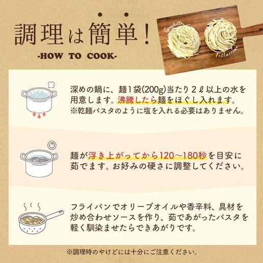 | お召し上がり方 | 1.深めの鍋に麺1袋あたり2リットル以上の水を用意します。沸騰したら麺をほぐし入れます。乾麺パスタのように塩を入れる必要はありません。 2.麺が浮き上がってから120〜180秒を目安に茹でてください。目安値の為、お好みの方さに調整してください。 3.フライパンでオリーブオイルや香辛料、具材を炒め合わせソースを作り、茹であがったパスタを軽くなじませたら出来上がりです。 調理時のやけどにはご注意ください。 | ||||||||||