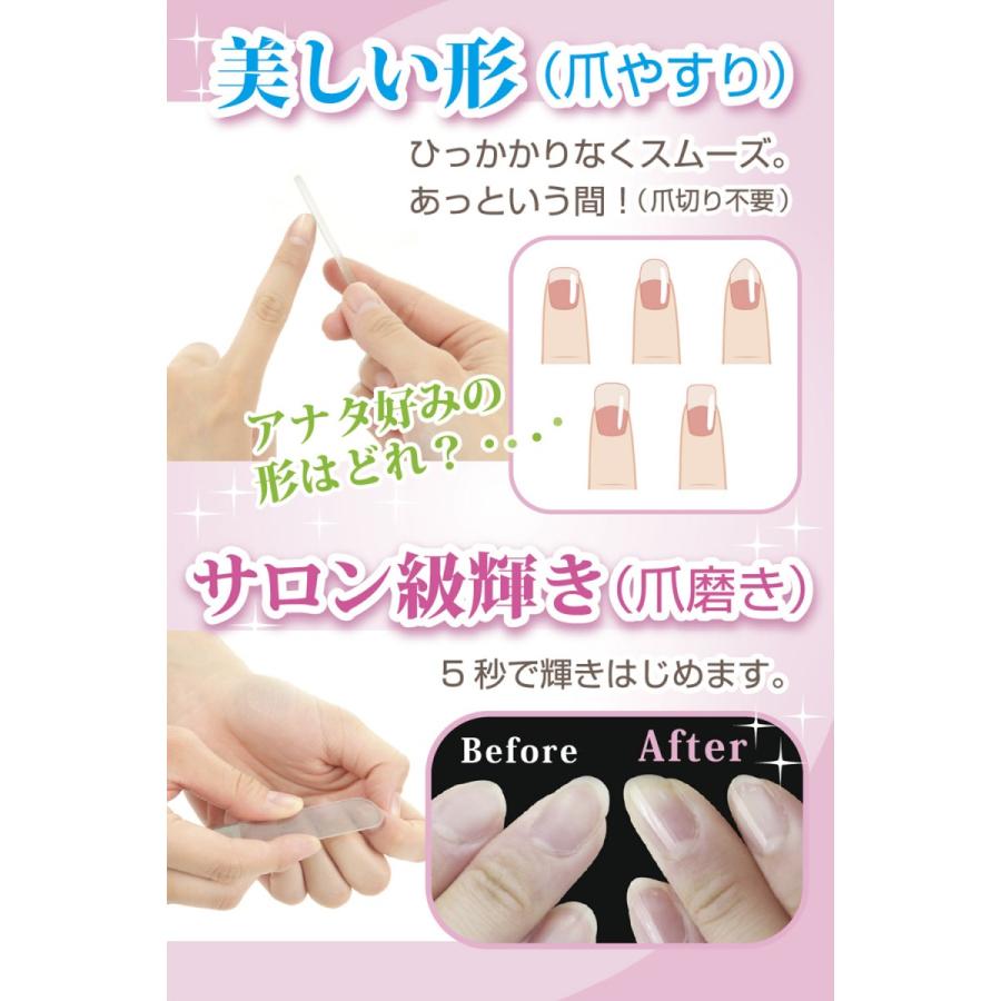 (1)誰でも使い方は簡単。2回目以降はもっと時短!半分以下の時間で仕上がります。(2)効果は2週間から3週間持続。(一度磨いて出た光沢は持続しますが、普段の生活の中で無意識の内に指がものに触れ、爪に細かい傷がつくことで、光沢は徐々に減っていきます。その際は再度軽く磨けば簡単に光沢がでます。)(3)使ったあとは流水で流して、水気を拭き、専用ケースに収納して下さい。(4)ピカピカになるでけじゃない! 磨いた後の爪を触ってみて下さい!縦筋や凹凸がなくなって、つるつる滑らか感動の手触りです。(頻繁に磨くと薄爪の原因になりますので、2週間ほど空けて下さい。)(5)爪の割れや2枚爪はほとんど爪切りや噛み癖によるものです。爪切りで切った衝撃で爪の断面には目に見えない細かいヒビが入り、そこから水分や油分が失われて乾燥してきます。乾燥がひどくなると割れが発生したり、2枚爪になったりするのです。爪きりの後はぜひガラス製爪やすりでキザキザになっている部分を滑らかにしてみてください。徐々に正常の爪に戻っていくのを実感できますよ。(6)ネイルサロンで爪のお手入れをしてもらうとお金もかかるし、定期的に通う必要がありますよね。La SACHIのナノガラスシャイナーならコストパフォーマンス最高!1本あれば、自宅で簡単にサロン級の輝きを維持することができます。家族みんなで使うこともできますよ。(7)仕事や学校でネイルアートができない人の爪磨きアイテムとして人気が高い!思った以上にピカピカの爪になるので、褒められ度がUPします。(8)マニキュアを使わなくても、トップコートを塗ったような光沢がでるので、子供や妊婦にも安心してご使用いただけます。(9)男性にもお薦めです。さりげないお洒落は綺麗な指先から。ビジネスシーンなどで好印象を与えることができますよ。(10)まずは自分からが指先美人になりましょう!その次はお友達や恋人にもお一つどうぞ♪(11)綺麗なパッケージだからプレゼントや、クリスマス プチプラ ギフトにもぴったり。