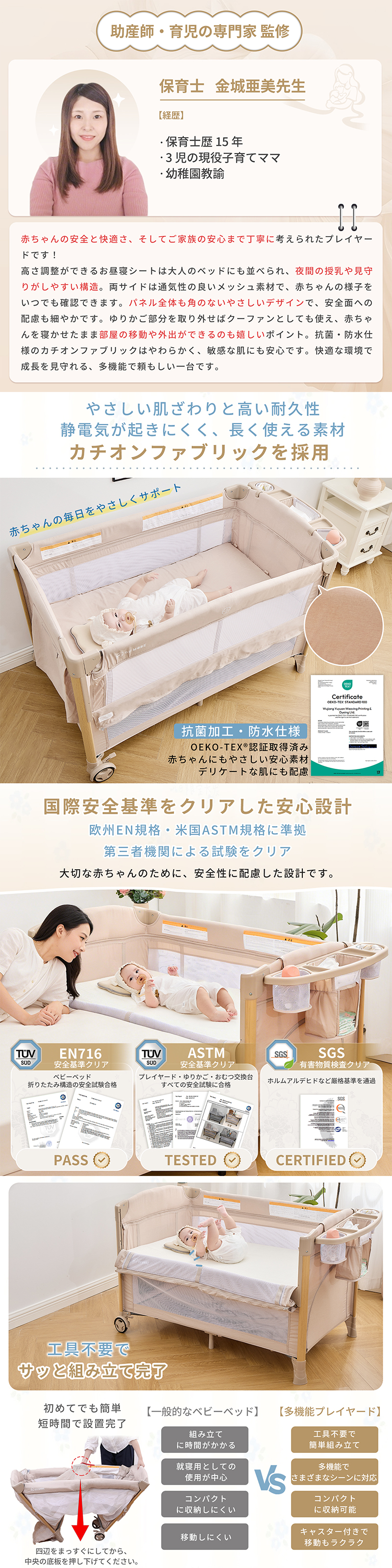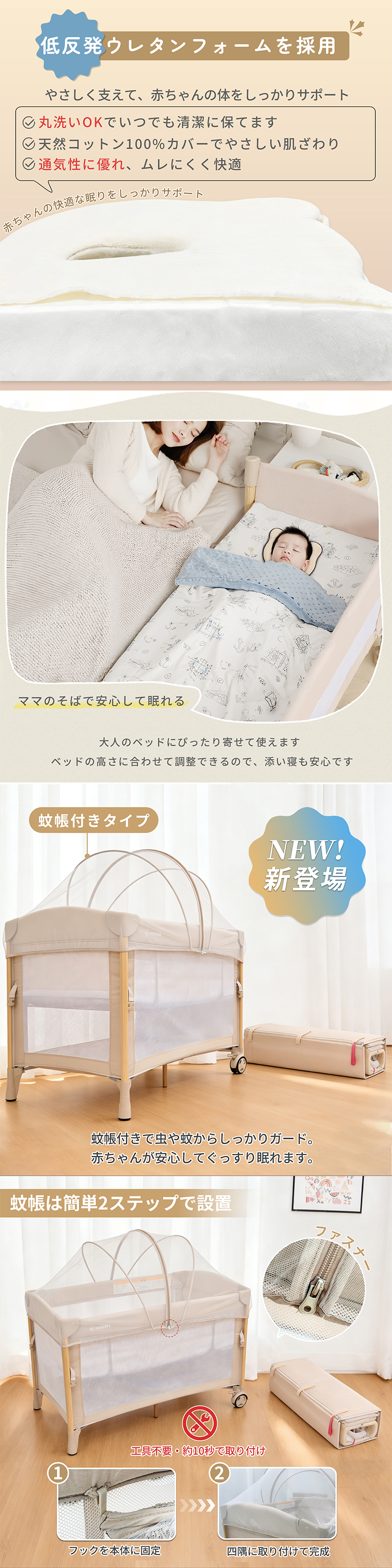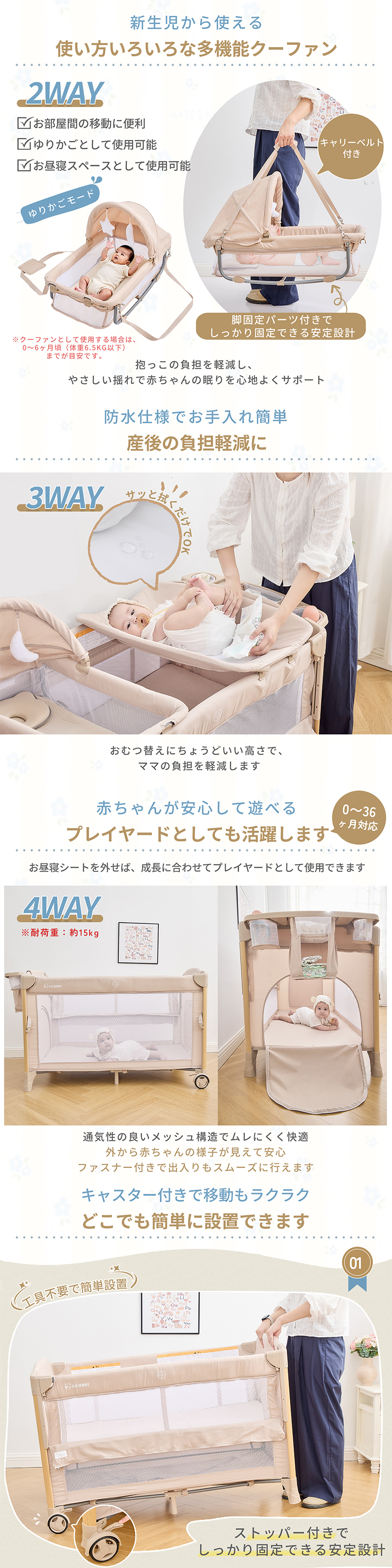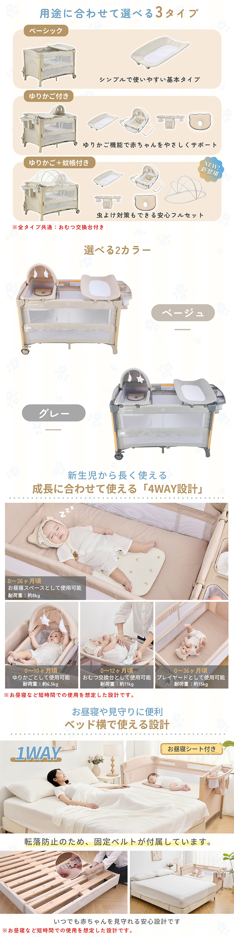 | 商品特徴 | 【4WAY仕様 】 新生児から幼児期まで長く使える多機能デザイン ・新生児期:ベッドやゆりかごとして安心して眠れる ・乳児期:おむつ交換台としてママ・パパの腰への負担を軽減 ・幼児期:安全なプレイヤード(ベビーサークル)として遊べる 【折りたたみ式で省スペース】 コンパクトに収納でき、移動や持ち運びも簡単。旅行や帰省にも便利です 【簡単組立】 工具不要で誰でもスムーズに設置可能。毎日の使用にストレスがありません 【安心の安全規格適合】 赤ちゃんがぐっすり眠れるように、やさしく包み込む形状で、ママのおなかの中のような安心感を再現。 【しっかりした耐久性】 ・静荷重:約60kg ・動荷重:約20kg 鉄管フレームと丈夫なカチオンファブリック&オックス生地で長く安心して使えます 【おむつ交換台付き】 赤ちゃんのお世話がしやすく、パパ・ママの負担を軽減します 【添い寝対応き】 赤ちゃんとご家族の距離を近く感じられ、安心してお使いいただけます |