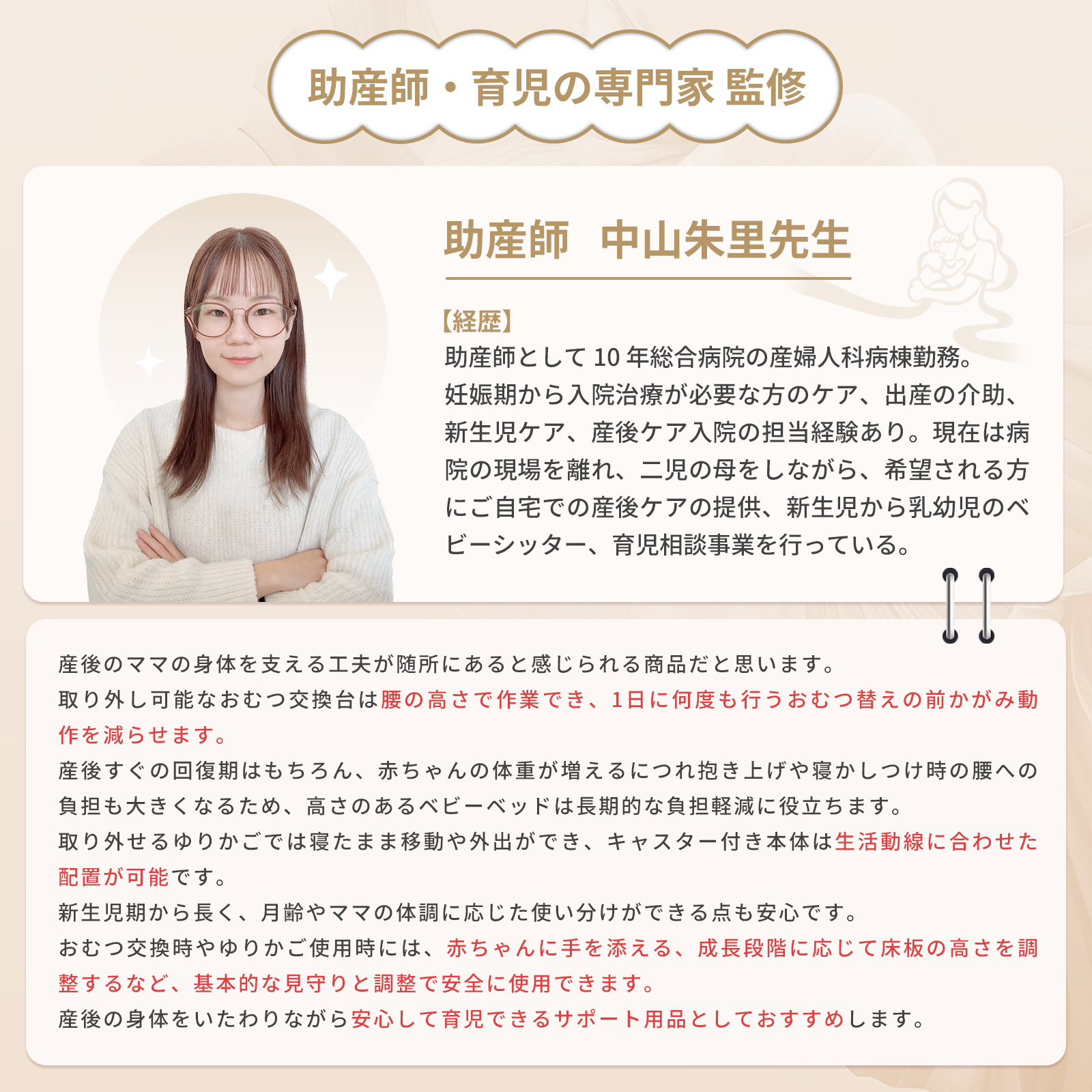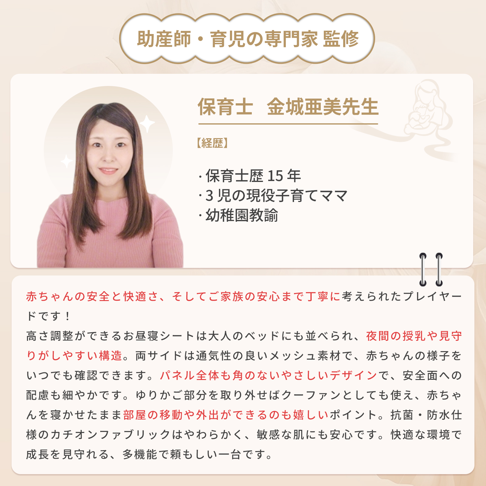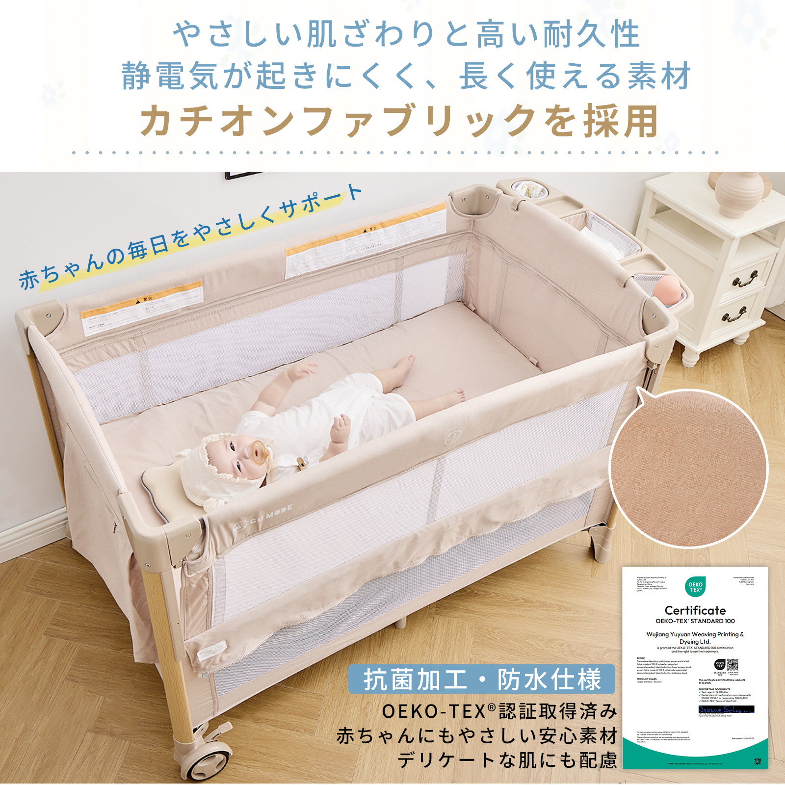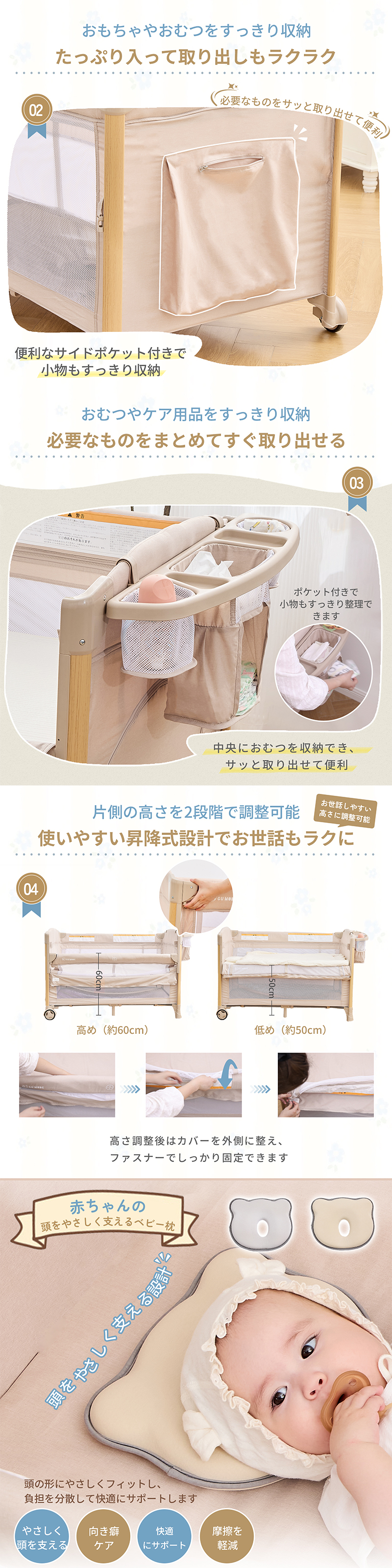 | 商品特徴 | 【4WAY仕様 】 新生児から幼児期まで長く使える多機能デザイン ・新生児期:ベッドやゆりかごとして安心して眠れる ・乳児期:おむつ交換台としてママ・パパの腰への負担を軽減 ・幼児期:安全なプレイヤード(ベビーサークル)として遊べる 【折りたたみ式で省スペース】 コンパクトに収納でき、移動や持ち運びも簡単。旅行や帰省にも便利です 【簡単組立】 工具不要で誰でもスムーズに設置可能。毎日の使用にストレスがありません 【安心の安全規格適合】 赤ちゃんがぐっすり眠れるように、やさしく包み込む形状で、ママのおなかの中のような安心感を再現。 【しっかりした耐久性】 ・静荷重:約60kg ・動荷重:約20kg 鉄管フレームと丈夫なカチオンファブリック&オックス生地で長く安心して使えます 【おむつ交換台付き】 赤ちゃんのお世話がしやすく、パパ・ママの負担を軽減します 【添い寝対応き】 赤ちゃんとご家族の距離を近く感じられ、安心してお使いいただけます |