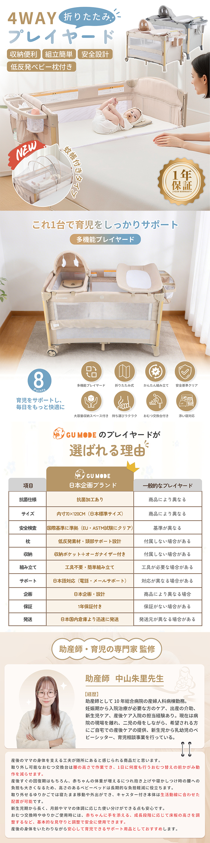 | こんな方におすすめ | ・赤ちゃんの寝床と遊び場を1台にまとめたい方 ・省スペースで使える折りたたみベッドを探している方 ・安全性・耐久性のしっかりしたベビー用品をお求めの方 ・出産祝いのプレゼントを検討している方 赤ちゃんとご家族の毎日に寄り添う、多機能プレイヤード。 これ1台で「寝る・替える・遊ぶ・ゆらす」が叶います。 安心安全な設計で、快適な子育てライフをサポートします。 |