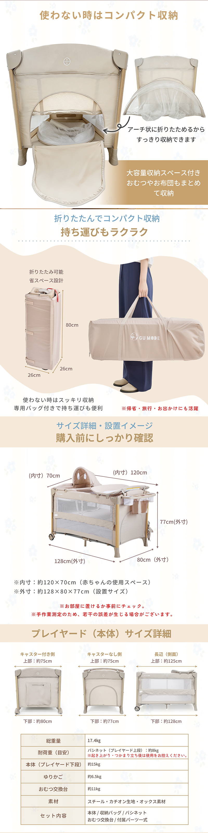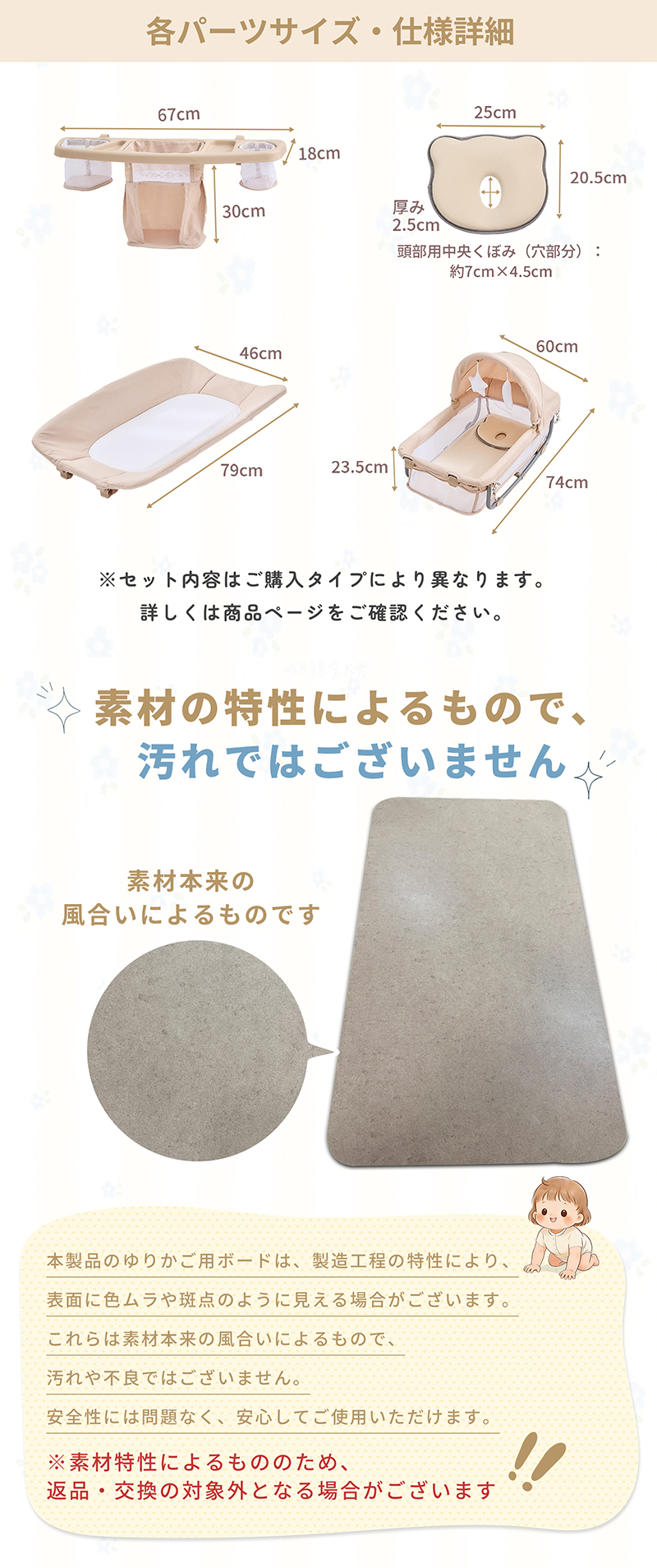 | セット内容 | 本体×1、収納バッグ、床板、バシネット(本体にセット済)、パイプ×4本、おむつ交換台、おむつ交換台用ジョイントバイプ×2、おむつ交換台用コの字パイプ×2、固定ベルト×2、オ一ガナイザ一×1 |