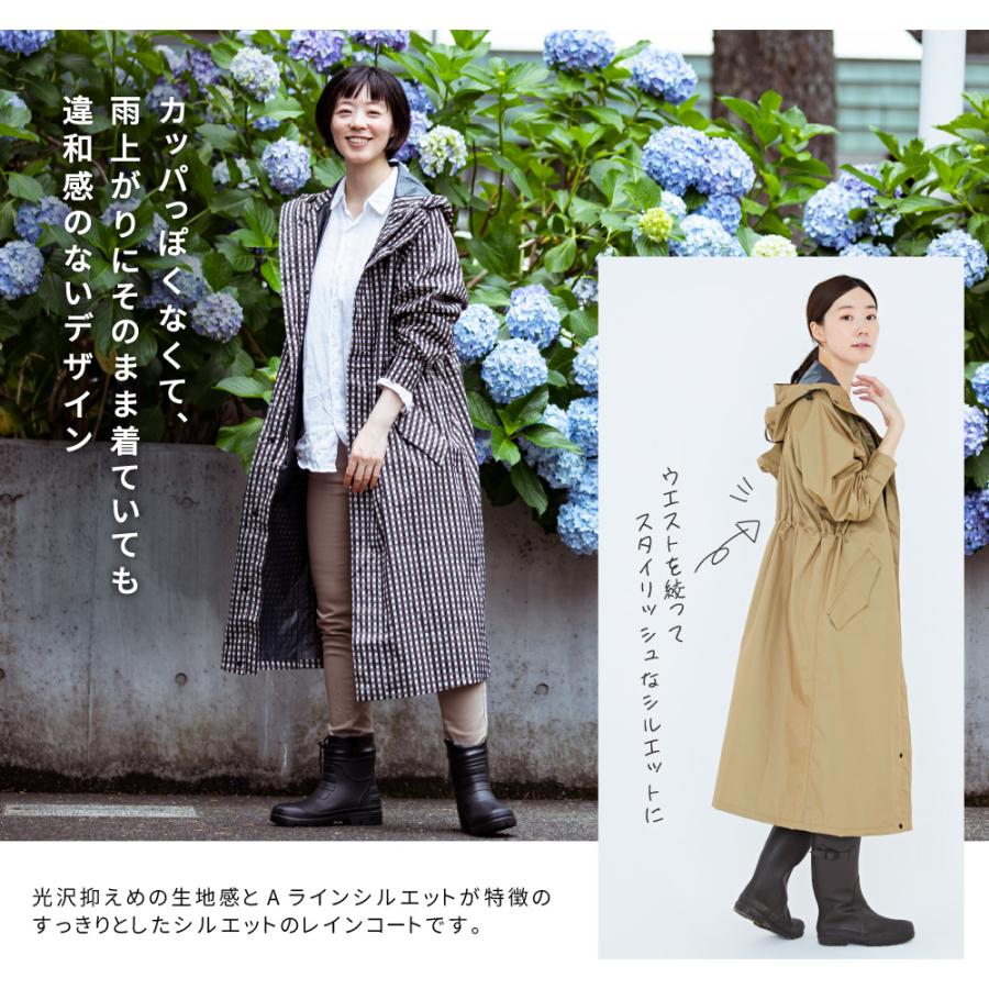 すっきりとしたシルエットのレインコート。光沢が抑えめの生地感とAラインのシルエットが特徴で、雨上がりにレインコートを着たまま電車に乗ったり、お店に入ったりしても違和感がないデザイン。グッドデザイン賞も受賞した当店人気の商品です。