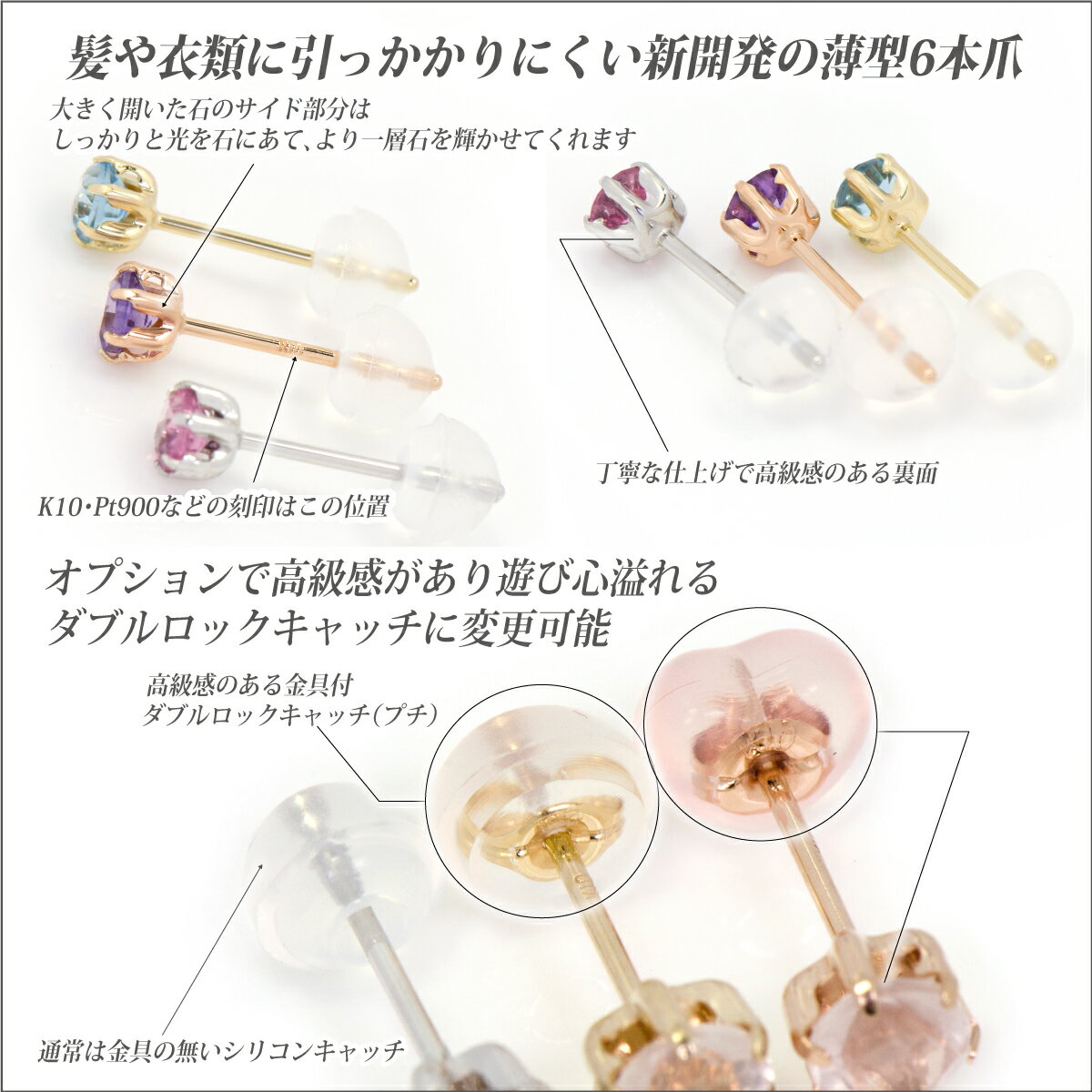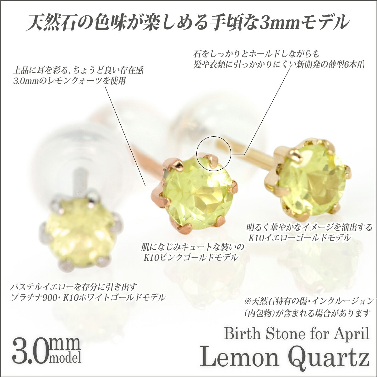 3ミリの誕生石を使った上品でシンプルな6本爪のスタッドピアス。 3mmともなれば、控えめながらも色味や輝き・透明度などの石の魅力を楽しんでいただける大きさ。プレゼントアイテムにも最適です。 従来の6本爪と違い、薄型の爪を使って装着時の髪や衣類での引っ掛かりを軽減。更に採光面積を大きくとることで、石をしっかりホールドしながらもより多くの光を取り込み、石の輝きをより強く引き出してくれます。 シンプルなデザインは飽きもなく、シンプルスタッドピアスの新定番と呼べるアイテムです。 素材はイエローゴールド、ピンクゴールド、ホワイトゴールド、プラチナの4タイプ。 通常の両耳用販売と、片方のみの片側販売もあります。 素材 K10 イエローゴールド サイズ 縦 3.2mm x 横 3.2mm ポスト直径0.65mm長さ約10mm 重さ 約0.2g(片方の重さ) 薄型6本爪ピアス3mmイエローゴールド 薄型6本爪ピアス3mmピンクゴールド 薄型6本爪ピアス3mmホワイトゴールド 薄型6本爪ピアス3mmプラチナ キャッチはこちらからお買い求めください。 薄型6本爪ピアス2.5mm 薄型6本爪ピアス4.0mm3ミリの誕生石を使った上品でシンプルな6本爪のスタッドピアス。 3mmともなれば、控えめながらも色味や輝き・透明度などの石の魅力を楽しんでいただける大きさ。プレゼントアイテムにも最適です。 従来の6本爪と違い、薄型の爪を使って装着時の髪や衣類での引っ掛かりを軽減。更に採光面積を大きくとることで、石をしっかりホールドしながらもより多くの光を取り込み、石の輝きをより強く引き出してくれます。 シンプルなデザインは飽きもなく、シンプルスタッドピアスの新定番と呼べるアイテムです。 素材はイエローゴールド、ピンクゴールド、ホワイトゴールド、プラチナの4タイプ。 通常の両耳用販売と、片方のみの片側販売もあります。 素材 K10イエローゴールド サイズ 縦 3.2mm x 横 3.2mm ポスト直径0.65mm長さ約10mm 重さ 約0.2g(片方の重さ) 薄型6本爪ピアス3mmイエローゴールド 薄型6本爪ピアス3mmピンクゴールド 薄型6本爪ピアス3mmホワイトゴールド 薄型6本爪ピアス3mmプラチナ キャッチはこちらからお買い求めください。 薄型6本爪ピアス2.5mm 薄型6本爪ピアス4.0mm