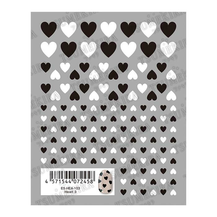 ※郵便で発送されるため、追跡はできません。他の商品と同時に注文すると送料無料になりません。商品未着・紛失等の保障対象外です。後払い決済はご利用いただけません(キャンセルとなります)。ほかのTSUMEKIRA(ツメキラ) ネイルシールはこちらから!たくさん使えるシンプルハート!かわいいデザインから甘すぎない大人っぽいものまで幅広く使えるモノトーンカラーです。しなやかフィットシート使用。パッケージサイズ 78mm×120mmシートサイズ 78mm×97mm本製品はジェル専用です。マニキュアは使用できません。・粘着力が強いためシールがはがれにくい素材になっています。何度もはがさずに、なるべく1回ではりつけて下さい。・ピンセットはなるべく先端のとがったものをご利用ください。・シールをはがす時には切れ目を軽くはずし、完全に浮かせてから軽く持ち上げて下さい。・シールを持つ時は、ピンセットの先だけで持ち上げないようにして下さい。注意事項*やわらかい素材ですので、剥がし始め等お取り扱いにご注意ください。*ネイルシールが薄いので、台紙から取り外す時には、台紙をそらしていただくと、より剥がしやすくなります。* 貼付ける際は空気が入らないように、端からゆっくりと貼付けてください。*ネイルシールを貼る面には凹凸が無いようにし、ネイルシールを包み込むようにジェルを塗ってください。剥がれの原因になります。*肌には直接貼らないでください。* 未硬化のジェルに使用しますと、粘着力が弱く、爪のカーブに定着しませんのでご注意ください。*小さなお子様やペットの手の届かない場所に保管をしてください。*爪に異常がある場合は使用を中止してください。また異常が現れた場合はすみやかに使用を中止し、専門の医師の相談を受けてください。* 直射日光や極端な高温低温・多湿を避けて保管してください。サイズ78×97mm個装サイズ:15×9×1cm重量個装重量:7g生産国日本