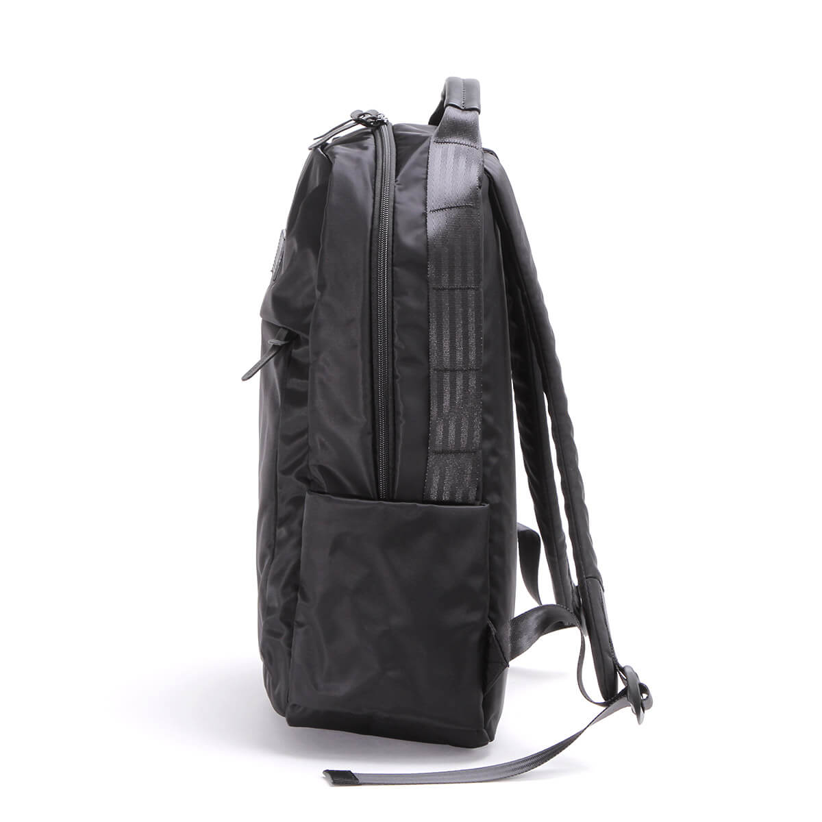 上品で機能的な、スーツOKのバックパック1983年にニューヨークで創業したブランド、マンハッタンポーテージ。そのバックボーンともいえる、メッセンジャーバッグのスピリットを継承した普遍的なデザインや高品質の素材、高い技術を駆使し、よりフォーマルなシーンに対応できるバッグとして開発されたのがブラックレーベルです。アーバンスタイルに適応したバッグであり、充実したスペックやデザイン性を兼ね備えた機能性、そして様々なシーンを想像することで生まれる多様性を追求し続けています。上品さと機能性を兼ね備えたバックパックは、都会的でスーツにも合わせやすいアイテムです。異素材ミックスが面白い、きれいめバックパックスーツスタイルやきれいめなカジュアルスタイルにも合わせやすい、都会的な雰囲気のバックパックです。光沢感のあるツイル素材が上品な印象で、柔らかくて艶のある質感を活かしたラウンドフォルムが特徴です。ポイントでレザー、シートベルトテープ、3M™BLACK REFLECTORが使用されており、ブラックカラーの異素材ミックスが楽しめるアイテムです。機能的なシートベルトテープ&高級感のあるデザインディテールサイドにシートベルトテープを大胆にあしらい、持ち手へとつながっています。このテープはデザインアクセントになると同時に、生地を補強する役割も担っており、バッグのシェイプをきれいに保ちます。トップの持ち手やファスナーの引き手、ロゴバッジにはレザーが使用されており、高級感のある仕上がりになっています。ポケットが充実したメインコンパートメントメインコンパートメントの背面側には、衝撃を吸収できるようにクッション性の高い素材を使用したPC専用ポケットが付いており、大切なPCを保護します。その手前には大きなメッシュポケットを配置。フロント側には3個のオープンポケットが付いており、すっきりと収納することができます。マチの幅が広いため、厚みのあるものもきちんと収まります。付属品アテンションカード(証明書)お手入れ方法コーティング加工されていないものは、予め防水スプレーで汚れを防ぎます。汚れた場合には消しゴムタイプのクリーナーで軽くこするか、ぬるま湯を絞った布で輪ジミにならないように叩いて拭きます。Manhattan Portageは1983年に創業したメッセンジャーバッグブランドです。多様な文化と日々著しい変化を遂げているニューヨークで今日に至るまでブランドのルーツに基づくプロダクトを一貫して作り続けてきました。Manhattan Portage BLACK LABELはそのルーツを踏襲し、よりアーバンスタイルに合わせたミニマムで洗練されたデザインと機能性を充実させた、オンオフ兼用で使用できる商品を提案しています。Manhattan Portage BLACK LABEL ブランドページへ