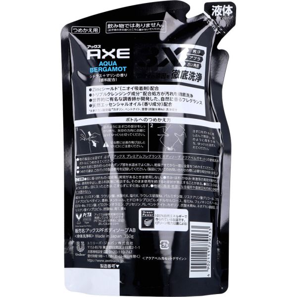 ギフトサービスについてユニリーバ・ジャパン株式会社個装サイズ:130X215X62mm個装重量:約359g内容量:350gケースサイズ:39.8X23X16.8cmケース重量:約6.8kg製造国:日本【発売元:ユニリーバ・ジャパン株式会社】【化粧品】身体洗浄料アックスPFボディソープAB【成分】水、ミリスチン酸、ラウリン酸、水酸化K、塩化K、ラウレス硫酸Na、パルミチン酸、ジステアリン酸グリコール、コカミドプロピルベタイン、香料、メントール、ヒドロキシプロピルメチルセルロース、塩化Na、フェノキシエタノール、EDTA-4Na、クエン酸、ピロクトンオラミン、グリセリン、PG、ベントナイト、カオリン、炭酸水素Na、ネオデカン酸亜鉛、ミリスチン酸イソプロピル、炭酸Na、青1、黄4【ボトルへのつめかえ方】(1)注ぎ口の部分をしっかり持ち、矢印の方向に点線に沿ってゆっくりと切ってください。※切る際には液の飛び出しと切り口にご注意ください。(2)注ぎ口をボトルに差し込んで固定し、両手で持ち、ゆっくりと注ぎ入れてください。【ご注意】・肌に傷・はれもの・湿疹等、異常があるときは使用しない。・赤み・はれ・かゆみ・刺激等の異常が現れたときは、使用を中止し、皮ふ科医等に相談する。そのまま使用を続けると症状が悪化することがある。・目に入らないように注意し、目に入ったときは、こすらずにすぐ洗い流す。・極端に高温・低温になる場所や直射日光のあたる場所には置かない。・他の製品とは混ぜず、必ず、「アックス プレミアムフレグランス ボディソープ アクアベルガモット」の使用済みボトルにつめかえてください。・つめかえ前に空のボトルの中とポンプ部を水道水でよく洗い、乾燥させてから一度に全量をつめかえてください。・飲み物ではありません。(お子様の手の届くところに置かないでください。)商品特徴一覧4902111-12、bodysoap、4902111779133、通信販売、通販、販売、買う、購入、お店、売っている、ショッピング▼関連商品はこちら。AXE(アックス) プレミアムフレグランス ボディソープ ブルーラベンダー 詰替用 350gAXE(アックス) プレミアムフレグランス ボディソープ ブルーラベンダー 440gAXE(アックス) プレミアムフレグランス ボディソープ アクアベルガモット 440g【AXE(アックス) プレミアムフレグランス ボディソープ アクアベルガモット 詰替用 350g】広告文責(有)イースクエアTEL:0120-532-772ユニリーバ・ジャパン株式会社個装サイズ:130X215X62mm個装重量:約359g内容量:350gケースサイズ:39.8X23X16.8cmケース重量:約6.8kg製造国:日本【発売元:ユニリーバ・ジャパン株式会社】【化粧品】身体洗浄料アックスPFボディソープAB【成分】水、ミリスチン酸、ラウリン酸、水酸化K、塩化K、ラウレス硫酸Na、パルミチン酸、ジステアリン酸グリコール、コカミドプロピルベタイン、香料、メントール、ヒドロキシプロピルメチルセルロース、塩化Na、フェノキシエタノール、EDTA-4Na、クエン酸、ピロクトンオラミン、グリセリン、PG、ベントナイト、カオリン、炭酸水素Na、ネオデカン酸亜鉛、ミリスチン酸イソプロピル、炭酸Na、青1、黄4【ボトルへのつめかえ方】(1)注ぎ口の部分をしっかり持ち、矢印の方向に点線に沿ってゆっくりと切ってください。※切る際には液の飛び出しと切り口にご注意ください。(2)注ぎ口をボトルに差し込んで固定し、両手で持ち、ゆっくりと注ぎ入れてください。【ご注意】・肌に傷・はれもの・湿疹等、異常があるときは使用しない。・赤み・はれ・かゆみ・刺激等の異常が現れたときは、使用を中止し、皮ふ科医等に相談する。そのまま使用を続けると症状が悪化することがある。・目に入らないように注意し、目に入ったときは、こすらずにすぐ洗い流す。・極端に高温・低温になる場所や直射日光のあたる場所には置かない。・他の製品とは混ぜず、必ず、「アックス プレミアムフレグランス ボディソープ アクアベルガモット」の使用済みボトルにつめかえてください。・つめかえ前に空のボトルの中とポンプ部を水道水でよく洗い、乾燥させてから一度に全量をつめかえてください。・飲み物ではありません。(お子様の手の届くところに置かないでください。)※お客さま都合による、ご注文後の[キャンセル][変更][返品][交換]はお受けできませんのでご注意下さいませ。※当店では、すべての商品で在庫を持っておりません。記載の納期を必ずご確認ください。※ご注文いただいた場合でもメーカーの[在庫切れ][欠品][廃盤]などの理由で、[記載の納期より発送が遅れる][発送できない]場合がございます。その際は、当店よりご連絡させていただきます。あらかじめご了承ください。※リニューアル等により パッケージ、仕様、セット内容 が変更になる場合がございます。予めご了承下さい。こちらの商品は【お取り寄せ(7〜10営業日以内に発送予定)】となります。あらかじめご了承くださいませ。
