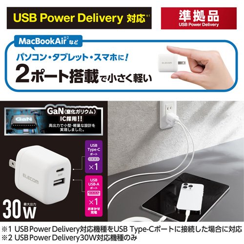 お店TOP>家電>スマートフォン・携帯電話>充電器・バッテリー>スマートフォン用充電器>エレコム USB Type-C 充電器 PD 対応 最大出力30W タイプC*1 タイプA*1 ホワイト (2個セット)【エレコム USB Type-C 充電器 PD 対応 最大出力30W タイプC*1 タイプA*1 ホワイトの商品詳細】●USB Type-C(TM)(USB-C(TM))ポートとUSB-Aポートの合計2ポートを搭載し、GaN(窒化ガリウム)を採用した小型で軽量、かつ高出力なUSB AC充電器です。●USB Type-C(TM)ポートは、USB Power Deliveryに準拠し対応するノートパソコンやスマートフォン、タブレットなどを超高速充電が可能です。●USB-Aポートは最大出力12W(5V/2.4A)で、おまかせ充電に対応しています。●GaN(窒化ガリウム)とは発熱を抑える事が出来る材料で、製品の小型化及び軽量化が可能です。●手のひらにすっぽり隠れるほど小さく(約42mm*30mm*39mm)、軽量(約58g)なので外出や出張などの際の持ち運びに便利です。●USB Power Delivery(パワーデリバリー)とは、アダプターと接続機器間で情報をやり取りすることで、その機器間における適した電力を選択し、高速充電を実現するUSB規格です。※本製品の最大出力は30Wです。●端末に応じて出力が5V/3A、9V/3A、15V/2A、20V/1.5Aと可変し、iPhoneなどのスマートフォンから、iPad Airなどタブレット端末、MacBook Airなどのノートパソコンまで幅広く高速充電できます。※USB Power Delivery 30W充電に対応した機種に限ります。●USB-Aポートは、最大出力12W(5V2.4A)でスマートフォンやタブレットなどを充電、給電ができます。●接続された機器を自動検知し、適した電流で充電できるおまかせ充電に対応しています。●出力端子が2ポートありますので、スマートフォンなどを2台同時に充電が可能です。※2ポート同時出力時は合計最大15Wとなります。(USB Power Delivery での出力はできません)●スマートフォン等に付属もしくは対応する充電用USBケーブルを使用して充電可能です。※本製品に充電用ケーブルは付属していません。●未使用時は電源プラグを折りたたんで充電器本体に収納可能です。スッキリとコンパクトに収納できるので、持ち運びにも便利です。●耐トラッキング性の要求事項(PSE:電気用品安全法)を満たしたコンセントプラグを採用しています。※本製品にケーブルは同梱しておりません。別途MFi認証品のUSB Type-C(TM)(USB-C(TM)) to LightningケーブルやエレコムのUSB規格認証USB Type-C(TM)(USB-C(TM)) to USB Type-C(TM)(USB-C(TM))ケーブル等をご用意ください。※端末本体や充電器が濡れた状態で充電すると、異常な発熱・焼損の原因となり大変危険ですのでおやめください。※USB Type-C(TM) and USB-C are trademarks of USB Implementers Forum●メーカー環境認定基準を1つ以上満たし、「THINK ECOLOGY」マークを表示した製品です。●廃棄物削減に取り組み、製品に同梱する取扱説明書等をペーパーレス化した製品です。●製品の包装容器におけるプラスチック重量を、メーカー内基準製品より20%以上削減した製品です。【規格概要】・対応機種:USB Type-C(TM)(USB-C(TM))ポートからUSB Power Delivery 3.0(30W)の規格内で充電可能な端末、またはUSB-Aポートから12W(5V2.4A)の規格内で充電が可能な端末。2ポート同時接続時、合計最大15Wまでの出力で充電、給電可能な機器とその組み合わせ。・定格入力電圧:AC100-240V 50/60Hz・定格入力電流:1A・定格出力電力:USB Type-C(TM)(USB-C(TM)ポート:最大出力30WUSB-Aポート:12W2ポート同時出力時:合計最大15W(USB Power Deliveryでの出力はできません)・定格出力電圧:USB Type-C(TM)(USB-C(TM)ポート:5V/9V/15V/20V、USB-Aポート:5V2ポート同時出力時:各ポート5V・定格出力電流:USB Type-C(TM)(USB-C(TM))ポートのみ使用時:5V時3A/9V時3A/15V時2A/20V時1.5A、USB-Aポートのみ使用時:5V時2.4A2ポート同時出力時:合計最大15W(USB Power Delivery での出力はできません)・外形寸法:幅約42mm*厚み約30mm*高さ約39mm・重量:約58g・カラー:ホワイト・使用可能地域:日本・保証期間:1年・コネクタ形状:USB Type-C(TM)(USB-C(TM))(メス)*1、USB-A(メス)*1・コンセントプラグ仕様:90度スイング構造・使用温度範囲:0度〜25度・法令:◇PSE 特定電気用品・その他:※USB Type-C and USB-C are trademarks of USB Implementers Forum【原産国】中国【ブランド】エレコム(ELECOM)【発売元、製造元、輸入元又は販売元】エレコム※説明文は単品の内容です。リニューアルに伴い、パッケージ・内容等予告なく変更する場合がございます。予めご了承ください。・単品JAN:4549550252133エレコム541-8765 大阪市中央区伏見町4丁目1番1号 9F0570-084-465広告文責:楽天グループ株式会社電話:050-5577-5042[携帯電話・スマートフォン周辺機器/ブランド:エレコム(ELECOM)/]