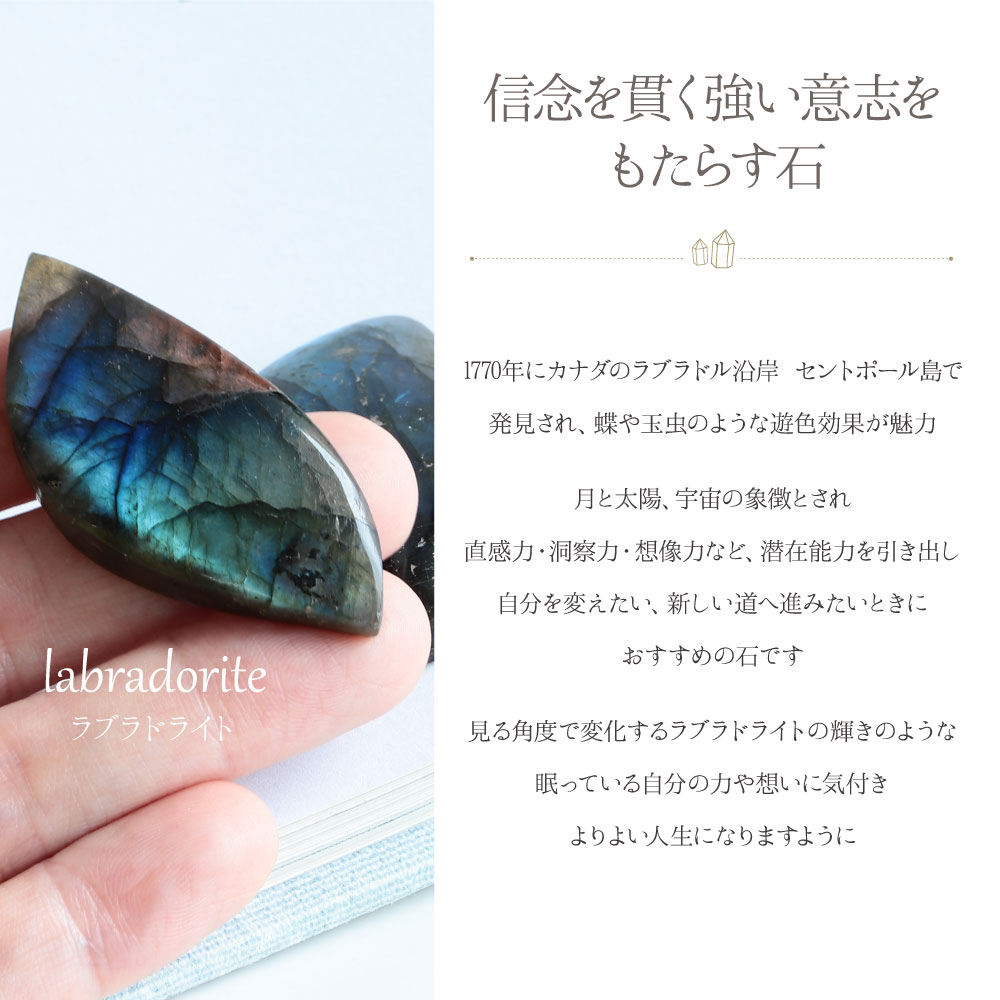 ギフト対応使用している パワーストーン 天然石パワーストーン 天然石ラブラドライト(曹灰長石)サイズ(A)Width:約4.1cmDepth:約0.9cmHeight:約4.1cmWeight:約12.4g(B)Width:約3.2cmDepth:約1.0cmHeight:約4.5cmWeight:約22.3g備考天然の物ですので不純物や内包物、色むら、天然キズ、ヒビがある場合がございます。また商品はできるだけ現物に近い色で撮影していますが、光源 カメラ モニター画面により実物と色が若干異なる場合があります。物重さ、商品のサイズなどは測り方によって誤差が生じる場合があります。パワーストーン 天然石 意味・言い伝えラブラドライト(曹灰長石)信念を貫く強い意志をもたらす石1770年にカナダのラブラドル沿岸 セントポール島で発見され、蝶や玉虫のような遊色効果が魅力月と太陽、宇宙の象徴とされ直感力・洞察力・想像力など、潜在能力を引き出し自分を変えたい、新しい道へ進みたいときにおすすめの石です見る角度で変化するラブラドライトの輝きのような眠っている自分の力や想いに気付きよりよい人生になりますようにInformation浄化について「浄化」してますか?疲れがたまって元気がでなかったり、本来の力が発揮できない時、私たちは休憩したり、リフレッシュしたりしますよね?パワーストーンや空間も同じ、休息が必要なんです。パワーストーンは、あなたにエネルギーを与えてくれたり、体や部屋の邪気・邪念を吸収してくれるといわれ、徐々にパワーが弱くなると考えられています。石を常に美しく清浄に保ち、エネルギーを充電させることが【浄化】です。「疲れているな・・・」「パワーストーンに元気がないみたい・・・」「お部屋もどんより・・・」と感じたら、「浄化」をしてエネルギーの『リフレッシュ&チャージ』を行いましょう。2026年厄年の方(男性)【前厄】2003年 平成15年生まれ 24歳 ひつじ/1986年 昭和61年生まれ 41歳 とら/1967年 昭和42年生まれ 60歳 ひつじ【本厄】2002年 平成14年生まれ 25歳 うま/1985年 昭和60年生まれ 42歳 うし/1966年 昭和41年生まれ 61歳 うま【後厄】2001年 平成13年生まれ 26歳 へび/1984年 昭和59年生まれ 43歳 ねずみ/1965年 昭和40年生まれ 62歳 へび(女性)【前厄】2009年 平成21年生まれ 18歳 うし/1995年 平成7年生まれ 32歳 いのしい/1991年 平成3年生まれ 36歳 ひつじ/1967年 昭和42年生まれ 60歳 ひつじ【本厄】2008年 平成20年生まれ 19歳 ねずみ/1994年 平成6年生まれ 33歳 いぬ/1990年 平成2年生まれ 37歳 うま/1966年 昭和41年生まれ 61歳 うま【後厄】2007年 平成19年生まれ 20歳 いのしし/1993年 平成5年生まれ 34歳 とり/1989年 昭和64年・平成元年生まれ 38歳 へび/1965年 昭和40年生まれ 62歳 へび※年齢は「数え年」です。対象男性 父 お父さん 息子 兄 弟 旦那様 彼氏 女性 母 お母さん 娘 姉 妹 嫁 奥様 妻 彼女 自分 お友達 友人 知人 お世話になっている方 レディース メンズ 中学生 高校生 大学生 社会人お店紹介ブランドSTONE WORLD私たちナチュレジェムスは、ストーンワールドの姉妹店です♪実店舗情報全国5店舗で直接ご覧いただけます!【埼玉】ピオニウォーク東松山 店【栃木】イオンモール佐野新都市 店【新潟】イオンモール新潟南 店:リバーサイド千秋 店【青森】サンロード 店↑2026年 天然石のお守り☆新調・使い初め・お買物のタイミングに↑新しい石をお迎えしたら、まずこれをしよう!↑あなたのピッタリな願い事をみつけよう! ↑↑心強さをくれる「最強の魔除け石」とは?心を整える「浄化」って何?▲詳細はココをCLICK!▲詳細はココをCLICK!▲詳細はココをCLICK!
