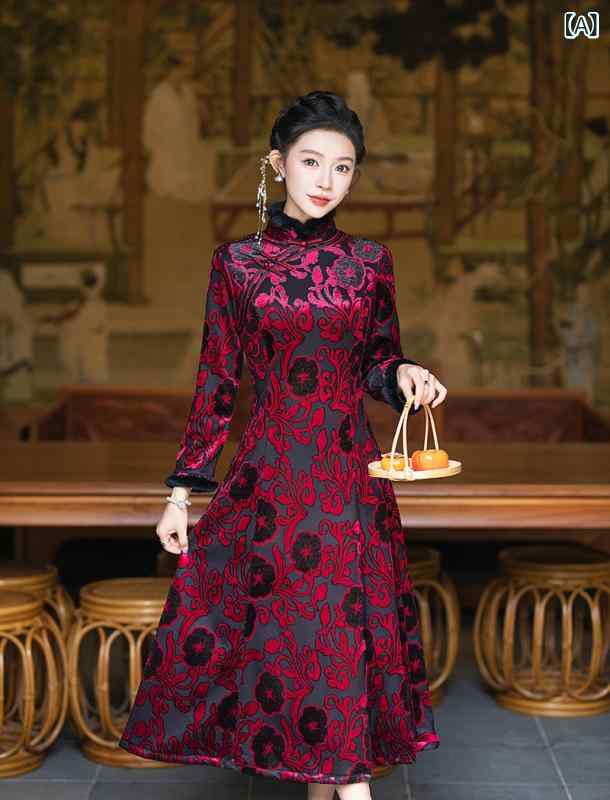 チャイナドレス レディース 秋冬 裏起毛 厚手 ママ ミセス 高級感 エレガント 上品 レトロ クラシカル 改良 スタンドカラー 斜め襟 パイピング 微ストレッチ 長袖 ロング丈 ワンピース