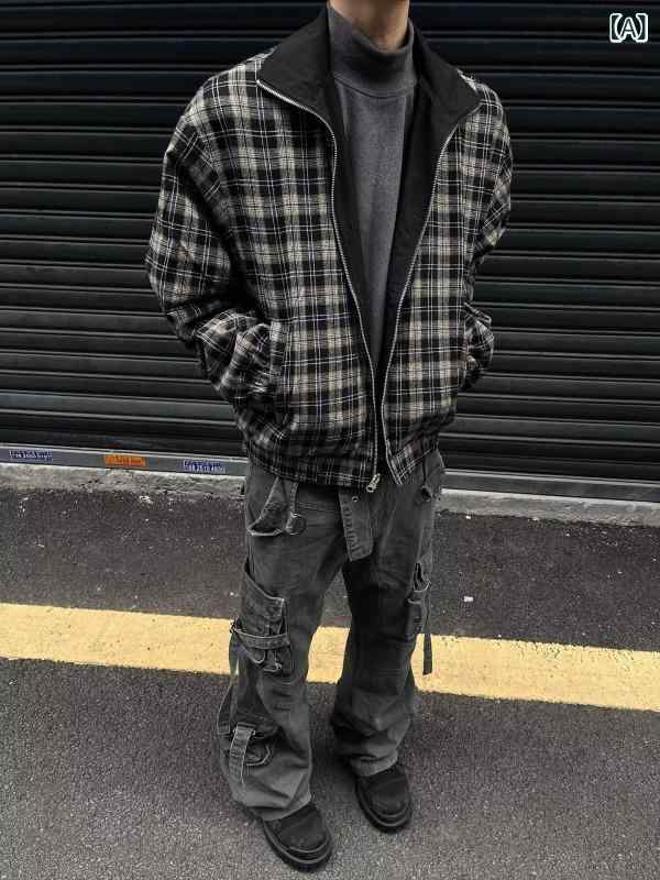 ジャケット メンズ 男性用 チェック柄 リバーシブル ブルゾン スタンドカラー 野球服 ジャンパー アウター 普段使い カジュアル ブラック