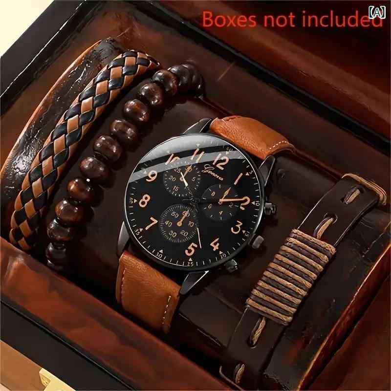 腕時計 メンズ 男性用 ビジネス ファッション レザー ブレスレット 4点セット ブラウン系