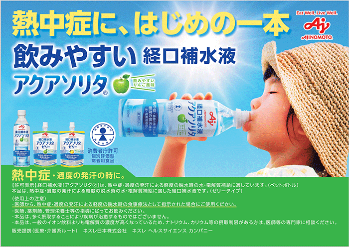 「アクアソリタ®」とは? 「アクアソリタ®」は、熱中症・過度の発汗による軽度の脱水時の水・電解質補給に適した経口補水液です。 熱中症時、汗をたくさんかいて水分不足が心配な時の水分補給に適しています。 すっきりした後味で飲みやすい経口補水液です。 経口補水液は水分を体内にしっかり保持 水分を体内にとどめておくためには、ナトリウム(塩分)も同時に摂ることが必要です。水だけとってもナトリウム濃度が低いと体液が薄まってしまい、水分をカラダに保持できず、尿として体外に出てしまいます。 個別評価型病者用食品とは 特別用途食品の中で、企業が提出したエビデンスが個別に評価され、特定の疾病のための食事療法上の期待できる効果が医学的、栄養学的に示されている食品として消費者庁が表示を許可するものです。 「アクアソリタ®」は個別評価型病者用食品としての表示許可を取得しています。 【摂取量目安】 学童~成人 :500~1000ml/日 幼児 :300~600ml/日 【栄養成分表示(100mlあたり)】 エネルギー:6kcal たんぱく質:0g 脂質:0g 炭水化物:1.4g 食塩相当量:0.2g カリウム:78mg 塩素:117mg ぶどう糖:1.1g 関与する成分の濃度 Na+ 35mEq/l K+  20mEq/l Cl- 33mEq/l ぶどう糖  1.1% 【摂取時の注意事項】 症状に応じて適宜増減してお飲みください。 本品は、多く摂取することにより疾病が治癒するものではございません。 医師から、熱中症・過度の発汗による軽度の脱水時の食事療法として指示された場合にご使用ください。 医師、薬剤師、管理栄養士等の指導に従ってお飲みください。 本品は、一般のイオン飲料よりも電解質の濃度が高くなっているため、ナトリウム、カリウム等の摂取制限がある方は、医師等の専門家に相談ください。 【取り扱い上の注意】 室温保存(直射日光を避け、なるべく涼しいところで保管してください)。 【賞味期限】 賞味期限まで1か月以上の物をお送りします。