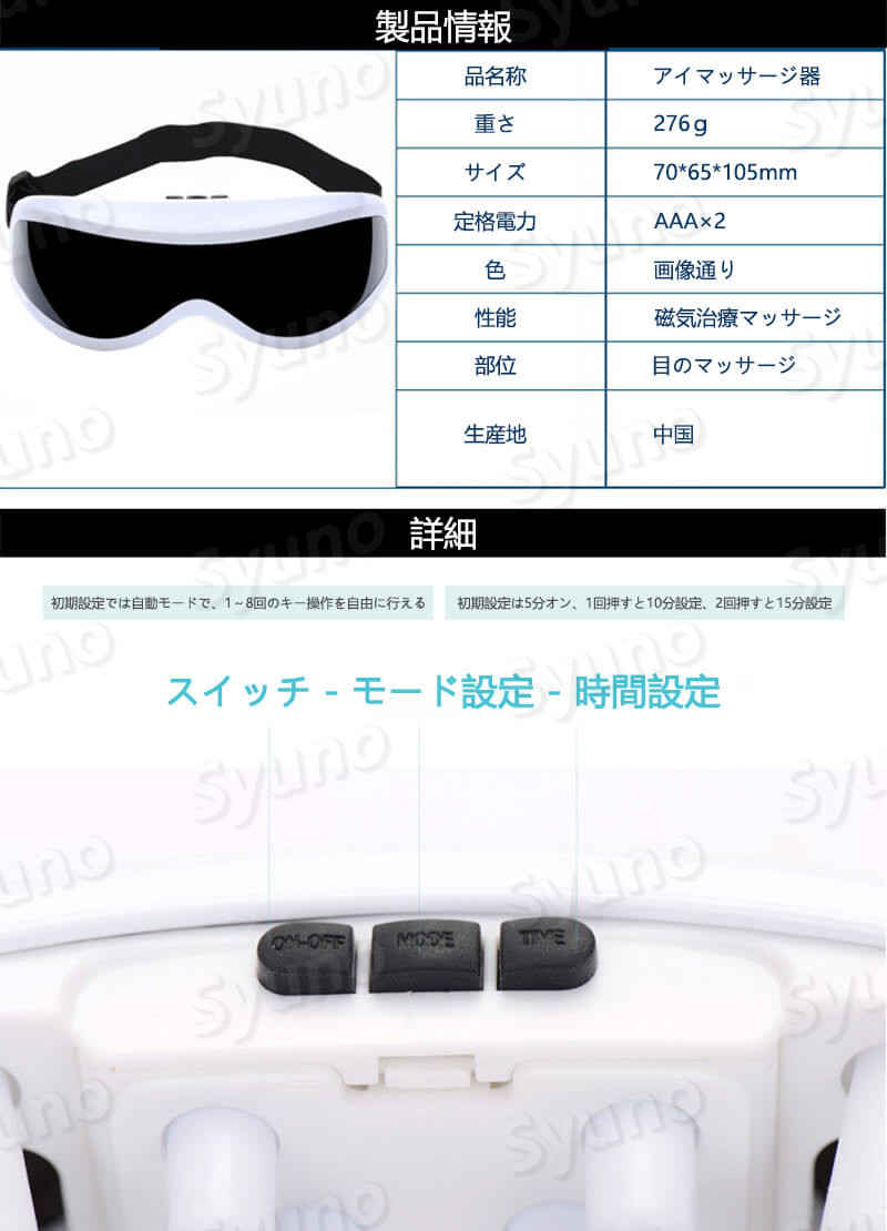 製品情報 製品名称:アイマッサージ器 重さ:276g サイズ:70*65*105mm 定格電力:AAA×2 色:画像通り 性能:磁気治療マッサージ 部位:目のマッサージ 生産地:中国 詳細 初期設定では自動モードで、1〜8回のキー操作を自由に行える 初期設定は5分オン、1回押すと10分設定、2回押すと15分設定 スイッチ - モード設定 - 時間設定