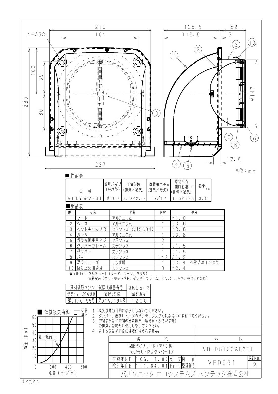材質:アルミニウム t1.0mm表面仕上げ:耐蝕処理仕上げ(クリアコート)ねじ止め用カウンターパンチ用半抜き穴付サイドアップ水切板付雨水浸入低減仕様壁面汚れ低減仕様ダンパー、温度ヒューズのメンテナンスが可能な場所に取付けてください。呼び径:φ150mm圧損抵抗係数:排気2.0、給気2.0直管相当長:排気17m、給気17m隙間相当開口面積:排気125平方cm、給気125平方cm質量:0.8kg温度ヒューズ溶断温度:120℃検索用カテゴリ276