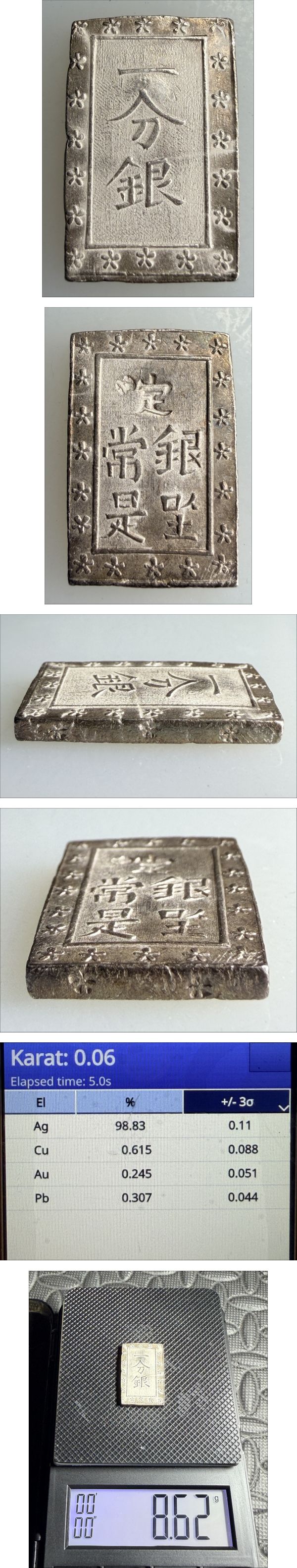 | 商品説明 | 【商品内容】 【本座 天保一分銀 Zn 】 真正品保証 【Zn】は日本貨幣カタログで【位付9】(10段階中)になっており 珍しいと思います。 【品位】 銀98.83% 金0.245% OLYMPUS VANTA 蛍光X線分析計機 (約400万円)で測定。 鑑定結果は写真に掲載しています。 【量目】:8.62g 【状態】: 【本座 天保一分銀 Zn】となります。 コンディションは写真でご判断ください。 現状で気に入っていただける方のみお願い致します。 計量器は安価な物ですので多少の誤差はあると思います。 発送は【おてがる配送ゆうパケットポスト】を選んでいただき コインホルダーに入れ、プチプチに包み さらにプチプチ付き封筒に入れて発送いたします。 ◆あくまで個人保管品です。 画像にてご判断いただき、ご納得いただける方のみご入札をお願い致します。 また画像には限りがございますので、色味が異なる場合などあるかもしれません。 詳細部分にこだわる方、完璧をお求めになる方、状態に神経質な方もご遠慮願います。 商品状態に関しては個人差がございます。 落札後の商品状態による返品や故障時の補償は一切お断りいたします。 (すり替え防止の為) ◆不要なトラブルを避けるため、3日以内のご決済、 速やかな受け取り連絡をお守り頂ける方のみとしております。 あらかじめご了承ください。 お守り頂けなかった場合、落札者都合キャンセルとさせていただきます。 以上、全てをご了解いただける方のみご入札をお願い致します。 ■新規の方及び、評価が低い方の入札は取り消させていただく場合がございます。 ■領収証の発行は対応しておりません。 |