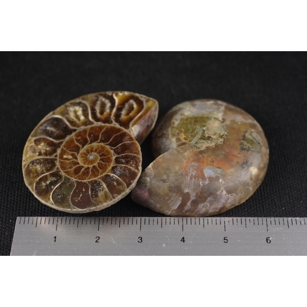 string(796) " マダガスカル産アンモナイトの化石を2つにカットし、切断面を研磨したペアのアンモナイトです。