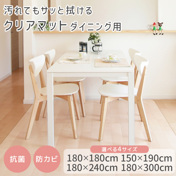 子供の食べこぼしの後片付けが大変。 ダイニングの床を汚れや傷から守りたい。 でも、汚れたマットをこまめに洗うのはめんどくさい…。 マットが滑りやすくて掃除機をかけるときにぐちゃっと丸まってしまう…。 そんなお悩みには、お洗濯不要!汚れやキズから床を守る、クリアダイニングマットがオススメです。 ■汚れ・水シミから床を守る 撥水性のあるPVC素材を使用してるので、汚れやシミに強く、 食べ物や飲み物をこぼしてもサッと拭くだけ!お手入れも簡単です。 抗菌・防カビ加工で、よりクリーンに。 ■傷や衝撃をガード 透明だから、インテリアの邪魔をしない! フローリングに敷くだけで、木目はそのままに、 落下物による凹みやテーブルや椅子の引きずりによる床へのダメージを防ぎます。 ■サラサラの感触でベタつかない 厚さ1.5mmタイプにはエンボス加工を施しているので、べたつきを感じさせないサラサラの手触りです。 マットな質感で、フロアになじみます。 ■ピタッとズレない快適設計 裏面が床にピタッと密着してズレを防止。 角丸設計でめくれにくく、ロボット掃除機も問題なく使用できます。 ■床暖房対応の耐熱仕様 100℃の耐熱加工を施しているので、床暖房の上での使用もできます。 ■カット自由自在! お好みのサイズにカットできるので、ダイニングテーブルやキッチンフロアマットに、 学習机 デスクマット、子供の遊び場やペットの床保護マットなど、自由自在にアレンジできます。 品番:FCCDI2 【商品仕様】 カラー:クリア サイズ(約):幅190cm×奥行150cm(厚さ1.5mm) 重量:(約)4.85㎏ 材質:軟質PVC 使用温度(約):-30℃~100℃ 【注意事項】 ※お手入れは薄めた中性洗剤を湿らした布につけ、固く絞って拭いた後、水分が残らないように乾いた布で乾拭きしてください。 ※日の当たる所で使用しないでください。日焼けで硬化する場合があります。 ※商品のサイズには個体差がございます。 ※サイズが大きい場合は、お客様自身で切ってご使用いただきますようお願い致します (ダイニングマット 透明 クリアダイニングマット PVC製 ソフトタイプ 保護シート テーブル キッチン クリアマット 透明マット テーブル クリア マット ダイニングシート クリアーダイニングマット テーブルマット) |