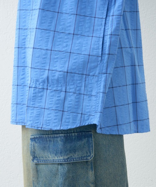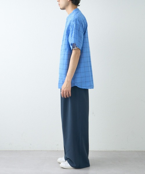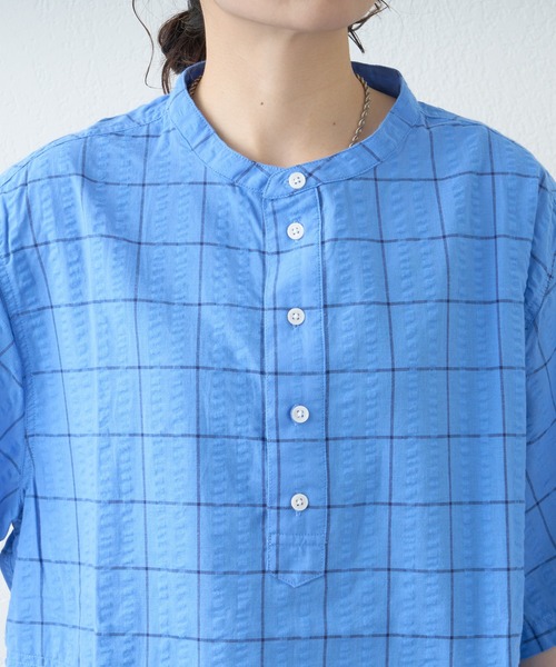 参考商品名:シアサッカーチェックバンドカラープルオーバーシャツ