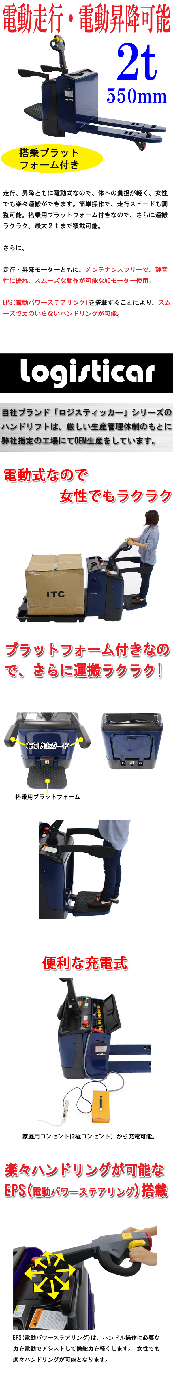 | 商品名 | 送料無料■新品■電動ハンドリフト EPS機能 ACモーター 乗車可能 簡易乗車タイプ 【電動走行・電動昇降】 自走式ハンドリフト電動式 電動ローリフト 充電式 キャッチパレットトラック 電動昇降 電動走行 ハンドリフト ハンドパレットトラック ハンドリフター 2t 幅550mm ■ele-lift-20r ブルー |
