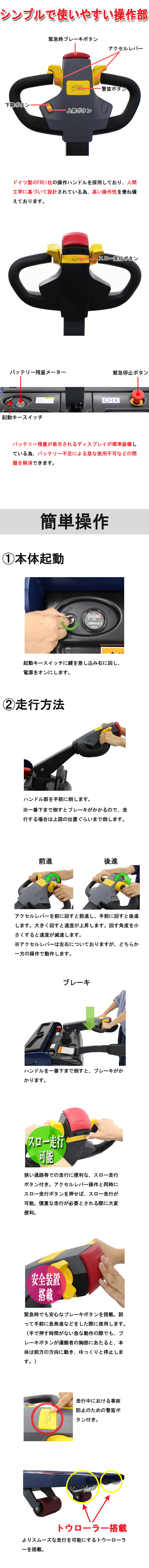 | 商品紹介 | ●走行、昇降ともに電動式なので、体への負担が軽く、女性でも楽々運搬ができます。 簡単操作で、走行スピードも調整可能。最大2tまで積載可能。 ●ドイツ製のFREI社の操作ハンドルを採用しており、人間工学に基づいて設計されている為、高い操作性を兼ね備えております。 ●AC制御モーターの採用により、滑らかな加速とブレーキングを実現しました。また、モーターブラシレスの採用により、メンテナンス費用の削減を実現しました。 ●EPS(電動パワーステアリング)の採用により、運転者のハンドル操作を電気信号に変換し、電動モーターの駆動により後輪キャスターを操作する為、運転者の意図する方向の走行が容易に可能です 。 ●バッテリー残量が表示されるディスプレイが標準装備されている為、バッテリー不足による急な使用不可などの問題を解消できます。 ●便利な充電式。 ●ローラーを2個搭載するするダブルローラーを使用。スムーズで耐久性にも優れたPU キャスターを採用。 ●スロー走行可能・・・狭い通路等での走行に便利な、スロー走行ボタン付き。 アクセルレバー操作と同時にスロー走行ボタンを押せば、スロー走行が可能。 慎重な走行が必要とされる際に大変便利。 ●組立不要の完成品。 ■均等荷重(kg):約2000kg ■材質:スチール、PU(車輪) ■モーター:AC(カーボンブラシを取り換える必要のないメンテナンスフリーモーター) ■走行スピード:約8KM/H(運搬物の重さによって変わります) ■上昇スピード:約0.03M/H(運搬物の重さによって変わります) ■下降スピード:約0.03M/H(運搬物の重さによって変わります) ■旋回半径:約1820mm ■登坂能力:約8〜20%(運搬物の重さによって変わります) ■バッテリー:24V/240AH ■電源:100V/50Hz〜60Hz ■重量:約720kg ■英文説明書付き ※北海道、東北(青森県、秋田県、岩手県、山形県、宮城県、福島県)・沖縄・離島の場合は、別途送料がかかります。予めご了承下さい。 尚ご注文の際は必ず、配送先に法人・事業所名の明記をお願い致します。 ★ご購入前の注意事項★ ●こちらの商品 大型の商品の為、 『西濃運輸の営業所止め』となります。 あらかじめご了承ください。 ●商品は大変重量がございますので、パレットに固定しての輸送となります。 荷受けには、フォークリフトなどが必要になります。(お客様ご自身で、ご用意お願いします。) ●新品商品ではありますが、輸入商品の為、多少の擦り傷などがある場合がございますので、 ご納得の上 ご購入下さいませ。 ●ご購入後、お客様ご都合による ご返品、ご返金等は一切お受け致しておりません。 ●本商品を使用した際に発生したトラブル、事故に つきまして、当社は一切の責任を負いません。 ご使用に関しましては、全て自己責任にてお願い致します。 |