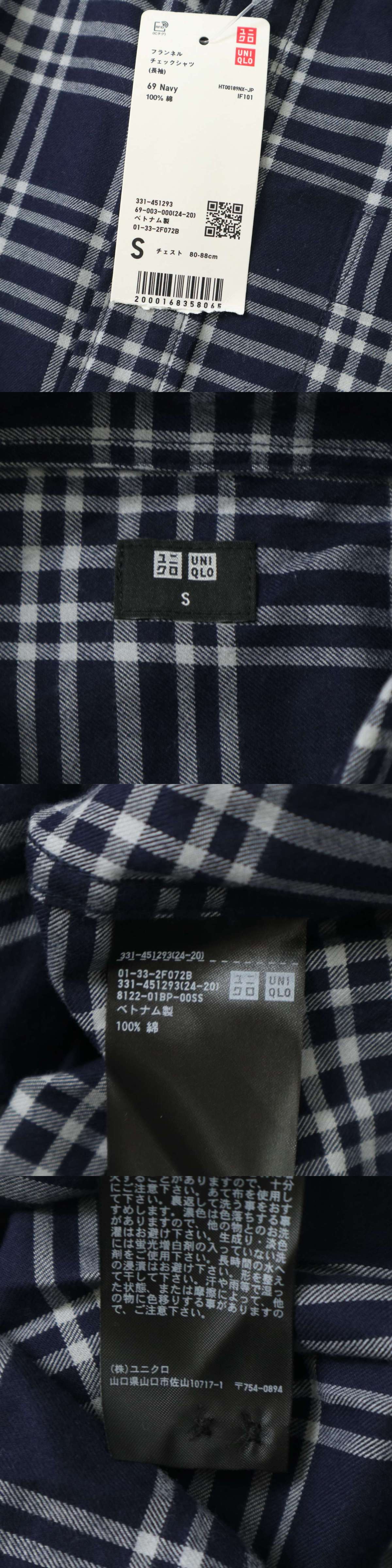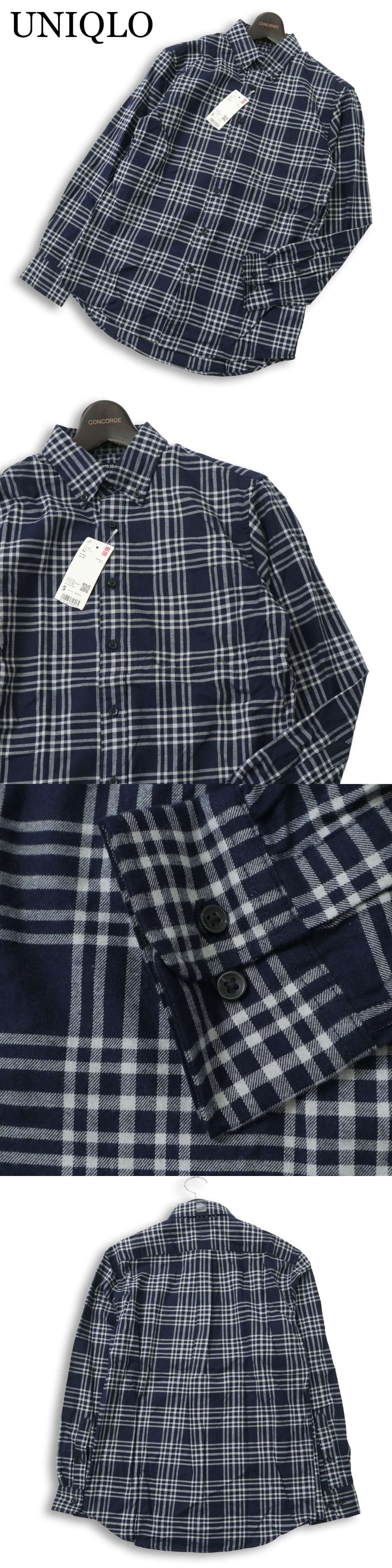 【新品 未使用】 UNIQLO ユニクロ 通年★ 長袖 フランネル チェック ボタンダウン シャツ Sz.S メンズ 紺 ネイビー