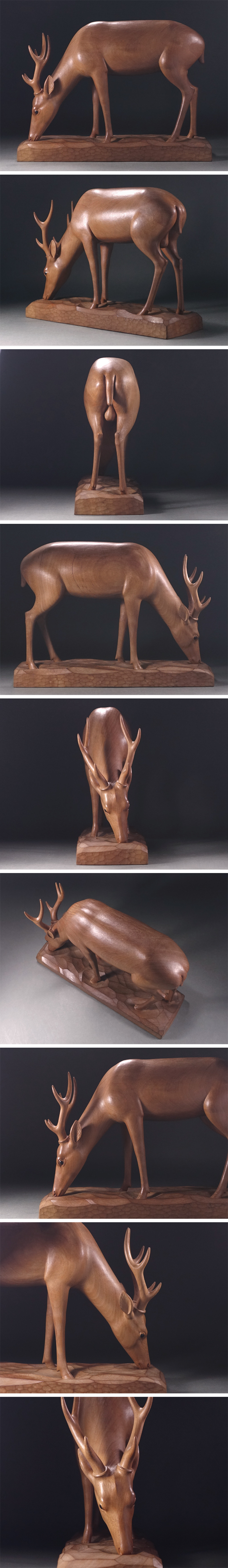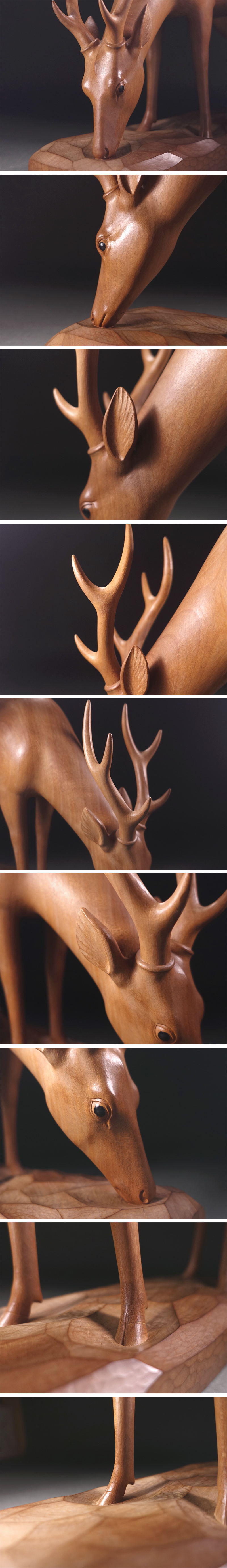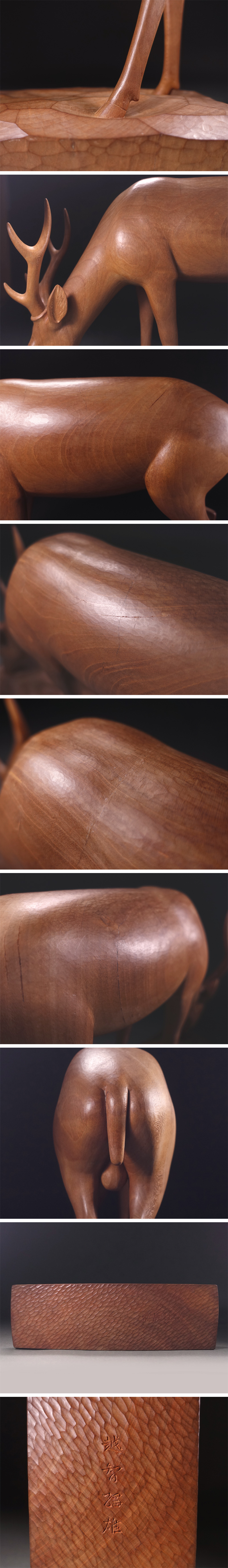 もちろん越智綱雄本人の手による貴重な作品で、なんと一木造にて神々しい一頭の鹿が表されており、素地となる木種は不明でしたが、美麗な杢目を特徴とする極めて上等な杢材が用いられています。