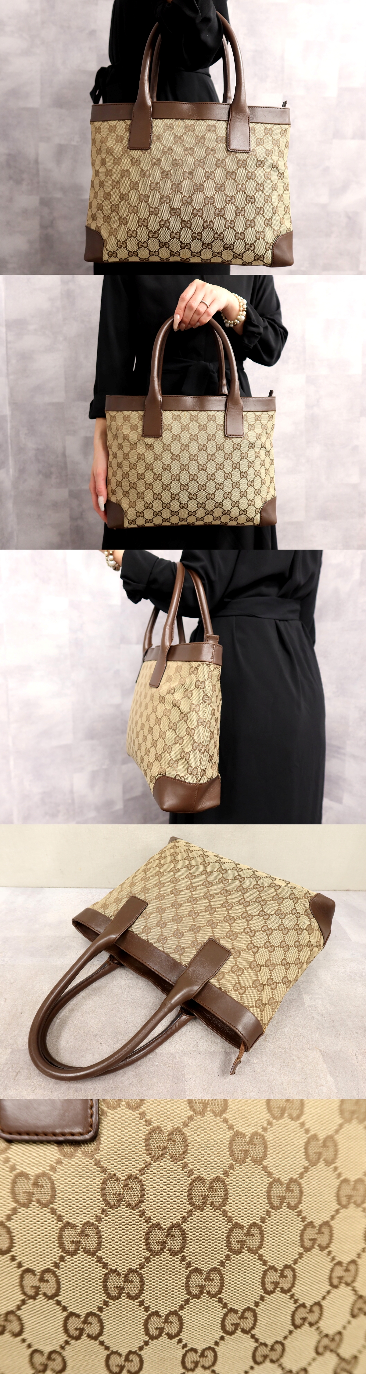 ●超美品●GUCCI グッチ●GGキャンバス カーフ レザー 本革●ハンド バッグ●ブラウン ベージュ●シルバー金具●イタリア製●B5●Js66581